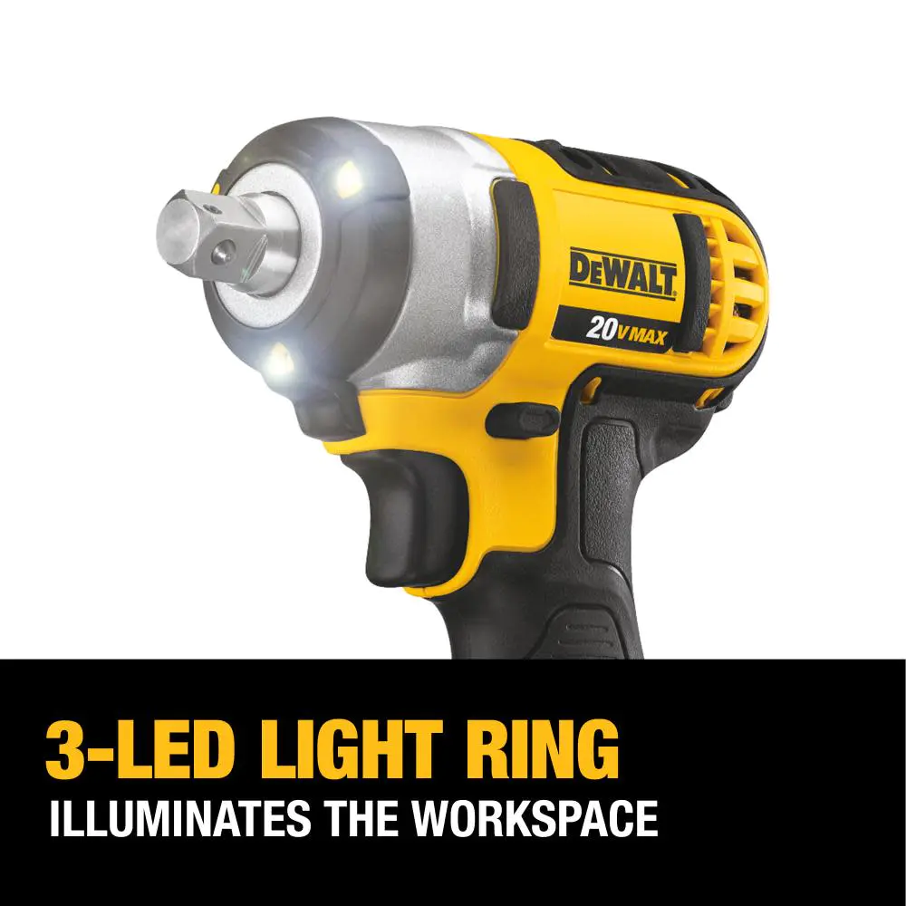 The DEWALT? 20V MAX* Lithium Ion 1/2-Inch Impact Wrench Kit gives you the power to remove or attach nuts and bolts effortlessly. It comes with two long-running XR? batteries and a charger so you can keep your wrench running all day long. This cordless impact wrench kit is just 5.7 inches long?S? so you can fit it into tight spaces common to cars and heavy machinery. An ant-slip grip lets you work with confidence and control. The impact wrench kit features an LED worklight so you can see where you??re working?S? even in the deepest areas of your workspace. It weighs only 3.4 pounds so you can carry and use this impact wrench all day long with minimal strain or fatigue.