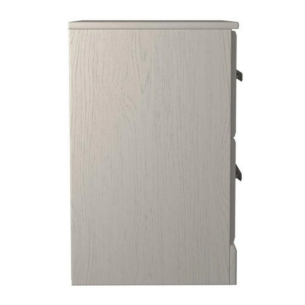 This stylish modern rustic nightstand is a simplistic, streamlined addition to your living room or bedroom, made from quality composite wood and decorative laminate. It is equipped with two whisper quiet gliding drawers and elegant pewter finished metallic bar handles, featuring a warm white replicated oak grain finish that cleverly add class to any interior decor style.