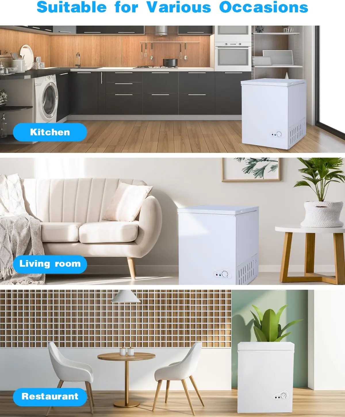 • Space-saving: 20.865 inches x 21.06 inches x 25.74 inches. The 3.5 Cu.Ft Chest Freezer can store food such as meat, pizza, cold drinks, fruits and vegetables, and ice cream in a small space. It can be placed in offices, dormitories, apartments, RVs, and other places.