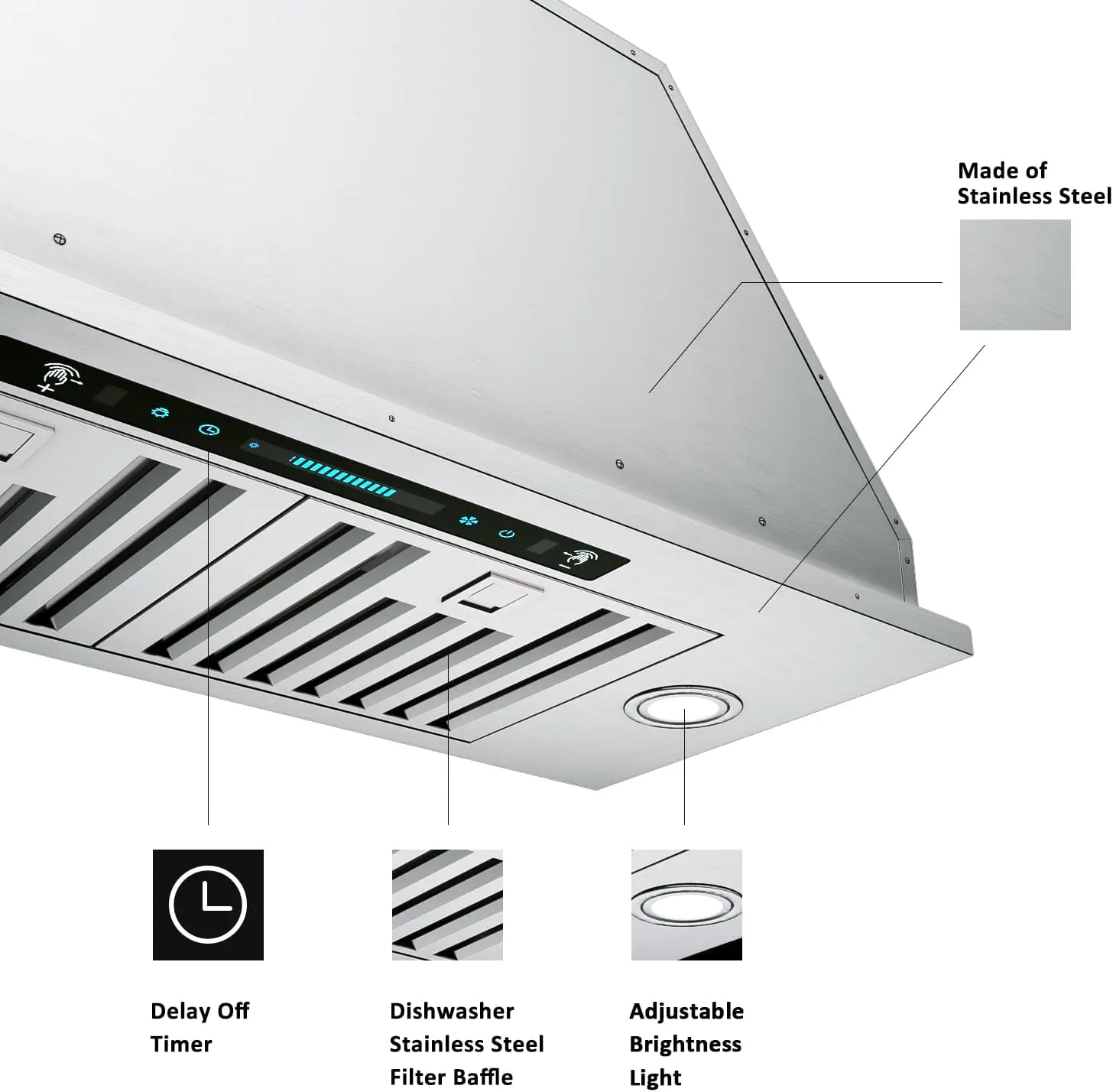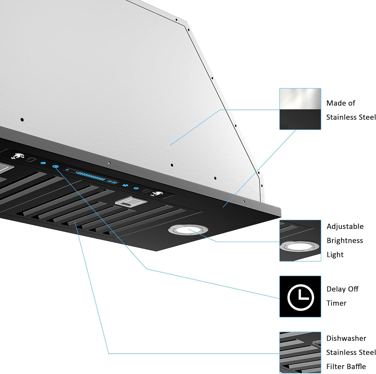 It not only boasts excellent performance such as strong suction and gesture function but also stylish design such as stainless steel wire drawing and touch buttons. Whether in terms of function or appearance, it is the highlight of your kitchen, allowing you to enjoy cooking to the fullest. It comes with two 3W lights that can adjust the brightness you want by just pressing and holding the light key. The default color temperature is 4000K. Also available in 6000k (sold separately). Make your daily cleaning process easier! This stainless steel baffle filter is designed with deep grooves to efficiently collect cooking grease. Its easy-to-remove and clean design allows you to reuse it forever just by putting it in the dishwasher. If you can’t vent to the outside, you can choose the ductless mode. The oily fumes will be filtered by the carbon filter (included in the package) and discharged back into the room. Brand IKTCH Product Dimensions 27.75??D x 11.8??W x 11.4??H Color IKB01 Special Feature Stainless Steel,Adjustable,Led Lights,Energy Saving,Touch Control,Removable Finish Type Brushed Brand Name ?IKTCH Model Info ?IKB01-30 Item Weight ?27.2 pounds Product Dimensions ?27.75 x 0.45 x 1.09 inches Item model number ?IKB01-30 Noise ?65 dB Part Number ?IKB01-30 Special Features ?Stainless Steel,Adjustable,Led Lights,Energy Saving,Touch Control,Removable Color ?IKB01 Control Console ?Touch, Remote Voltage ?120 Volts Material Type ?Stainless Steel, Alloy Steel Batteries Included? ?No Batteries Required? ?No iKTCH Range Hood Insert IKB01 Series