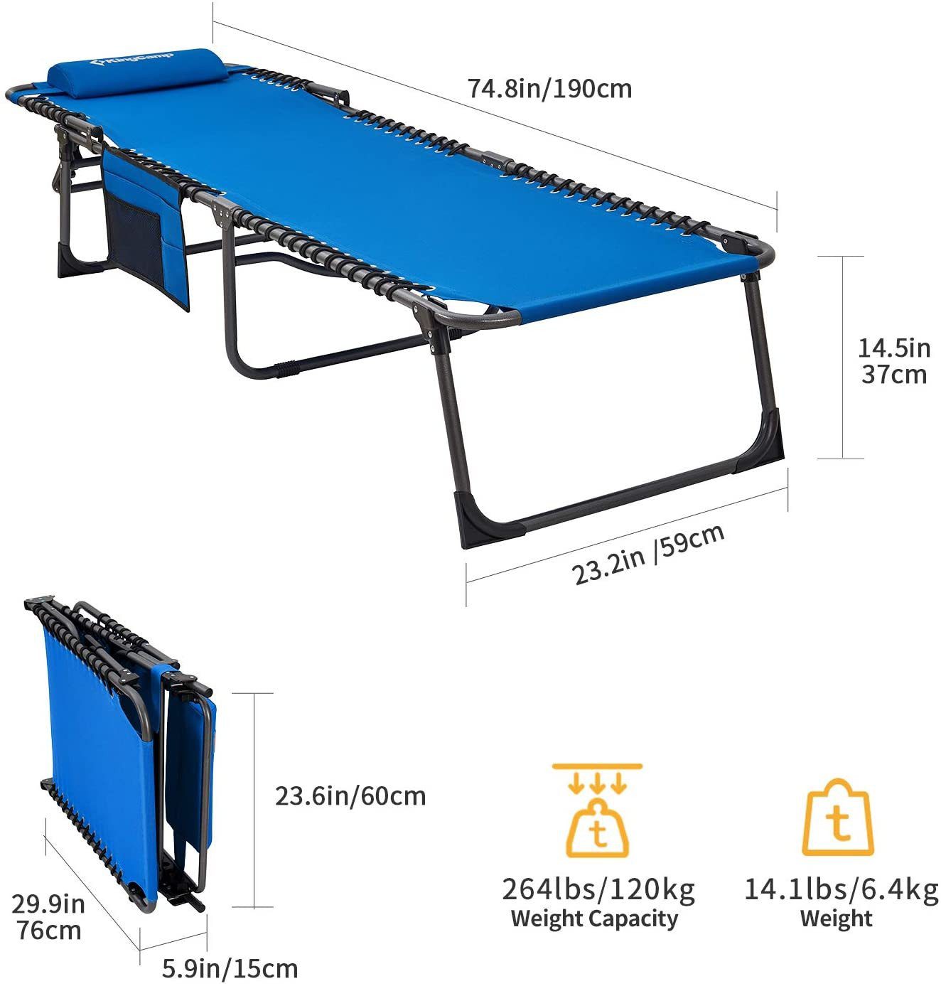 - ??Sturdy and Comfy??The dimension of the outdoor lounge chair is 75 x 23.2 x 13.3 inches, fits people up to 6.2 feet. Packed size: 29.9 x 5. 9 x 23.6 inches, weight 14.1 lbs. Tri-fold design is easy to store and carry. Constructed of anodized steel and durable 600D oxford fabric suspended by double bungee system, footrest cover and foot pads make it slip resistant on hard ground surfaces. Heavy duty steel frame, supports up to 120kg /264 lbs.