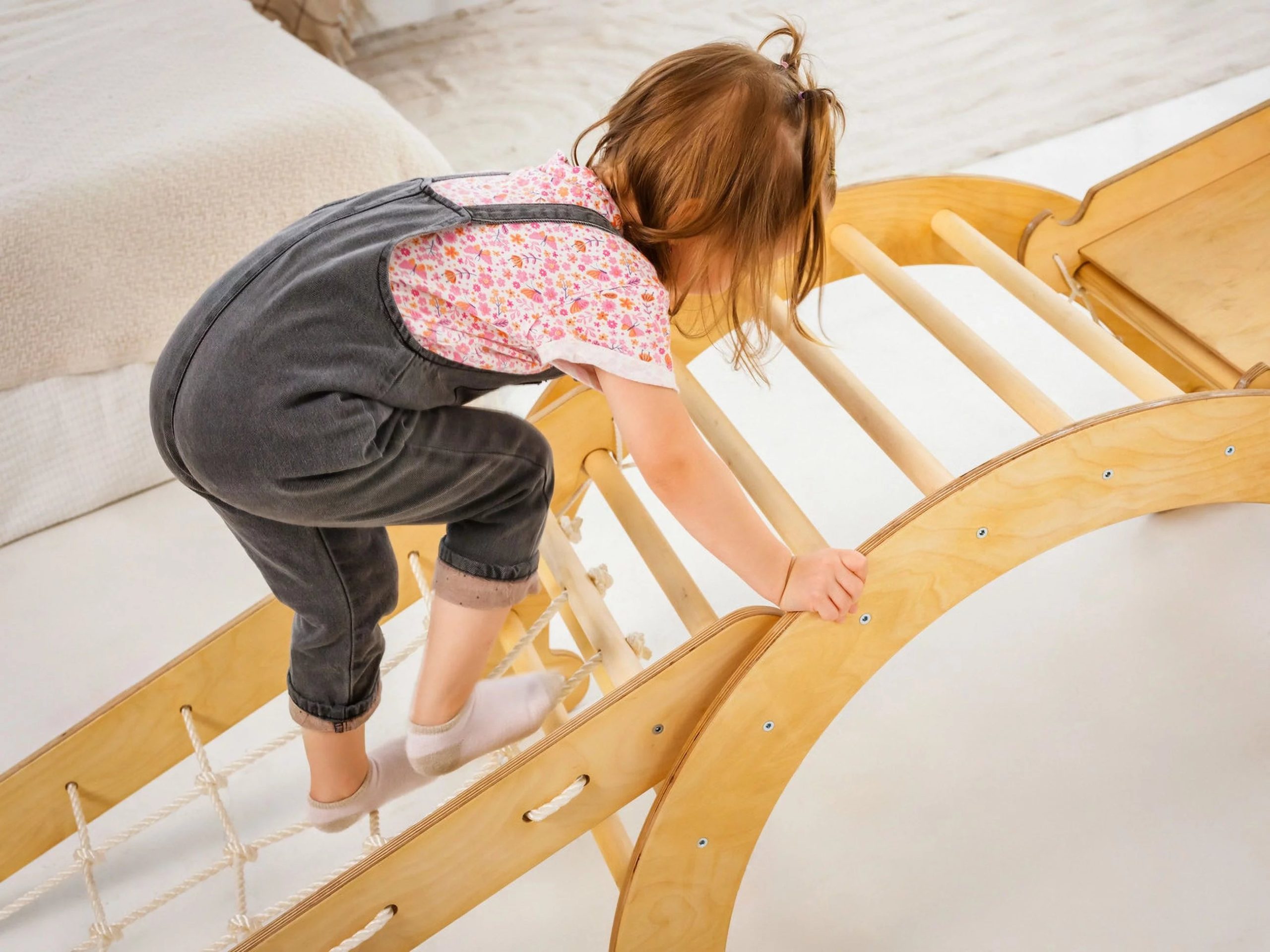 Looking for the perfect outdoor/indoor jungle gym to draw all of the excess energy out of your kids? Goodevas 4-in-1 toddler playset combines the full catalog of our Montessori wooden toys all in a single piece, providing a multipurpose playground set with countless opportunities for kids to have fun and enjoy themselves. The toddler climber foldable ladder has 5 locking positions and can be adjusted from 45?? to 150??. The toddler slide board is smooth and well constructed; turns into a climbing ramp when flipped. The wooden arch is a perfect choice for babies and toddlers, as it turns into a rocker when flipped. Working with the climbing net heavily benefits hand-eye coordination and is one of the best flat-feet prevention toddler toys out there!?