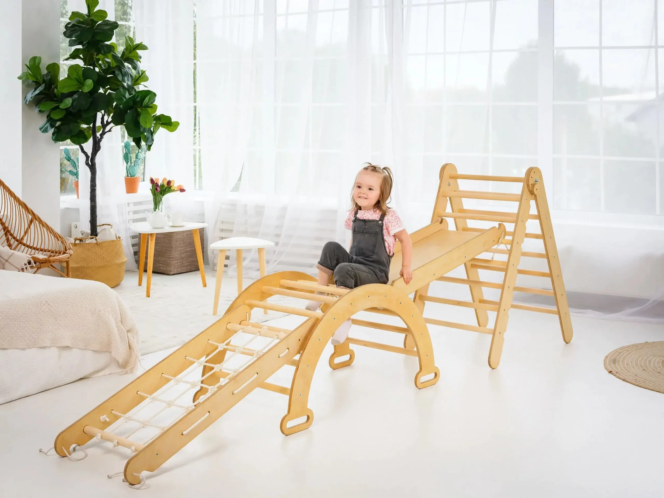 4-in-1 Montessori Indoor Playground: Wooden Foldable Triangle Ladder + Climbing Arch (Rocker Balance) + Slide Board (Ramp) + Spider Net for Kids 1-7 y.o.