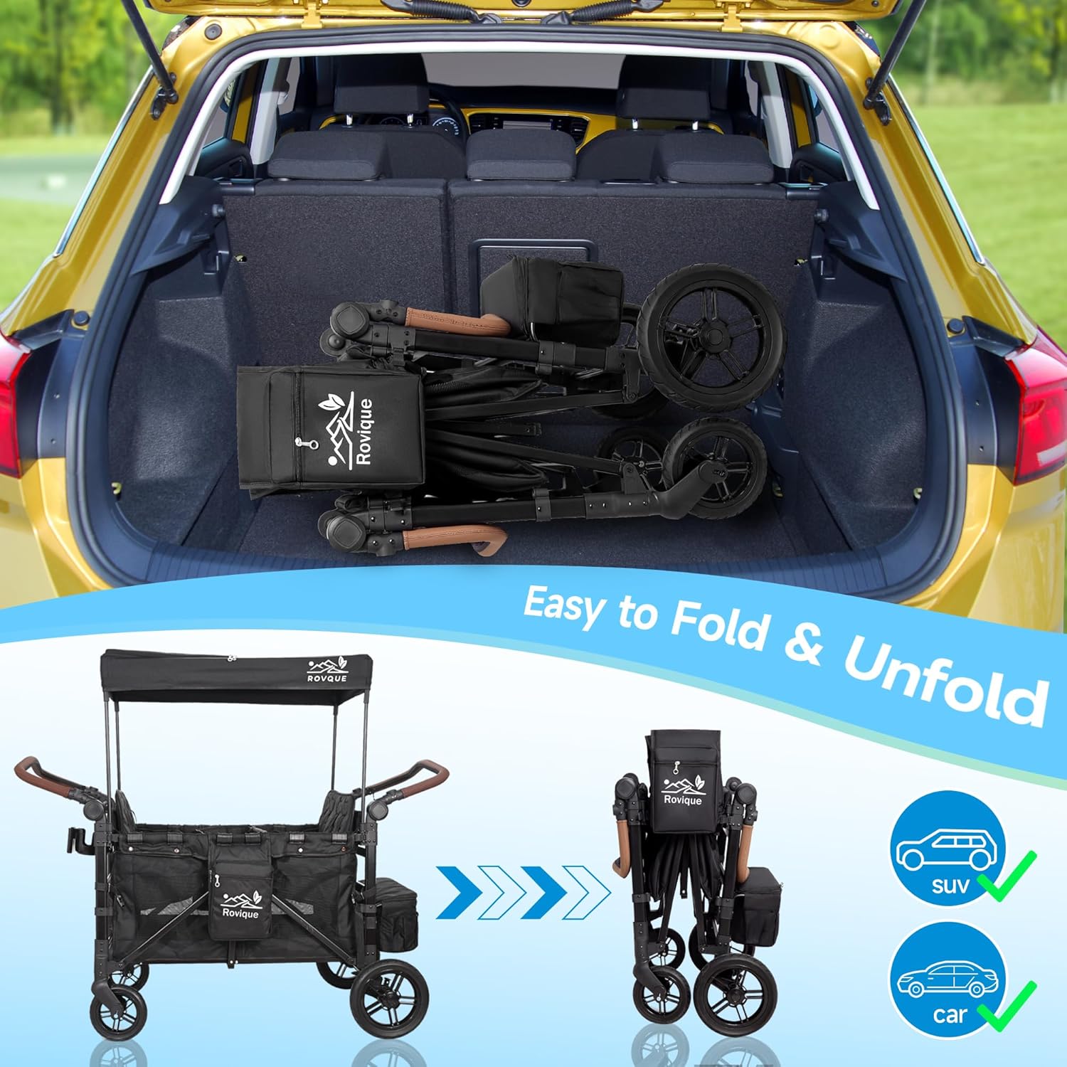 4 Seater Wagon Stroller,Foldable All-Terrain Quad Wagon Stroller with Canopy,Detachable Tray,Adjustable Handle,High Seat & Large Storage,Black