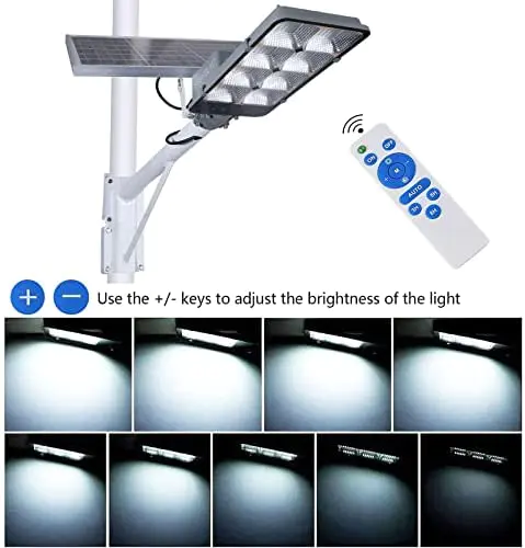 Specifications: Product Name: Dusk to Dawn Solar LED street light /LED Solar Pole Light/Solar Street Light with Remote Control/Outdoor Solar Wall Light Material:Aluminum/Glass Wattage:450w Power Source??Solar Powered Style??Commercial LED street light Special Feature??IP65 Waterproof, Motion-Sensor, Dawn-To-Dusk Sensor Mode:Light sensor/motion sensor/Remote Control Charging time: 4-6 hours Solar street light working time: 10-15 hours after fully charged Working Temperature: -25??-60?? Color temperature: 6500K Battery capacity??2*45000mAh Luminous flux :2000 lumens Package List: Solar light+ Solar panels +Bracket+accessories+screws +Wireless remote control ( batteries not include)+instruction book Note:(please test whether the floodlight is working properly before installation). Applicable Site: The solar led light is suitable for street and roads, courtyard, parks, squares, private gardens, courtyard, etc Guarantee: We hope to provide every customer with a perfect shopping experience!After you receive the goods, if you have any questions, please contact us in time, we are happy to solve the problem for you!About this item