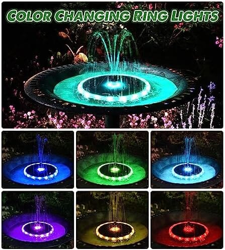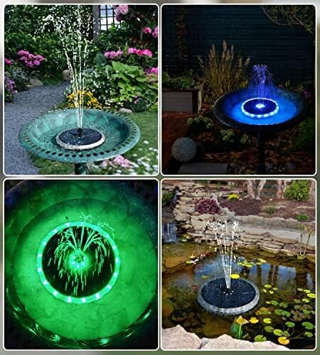 - & : Our solar fountain for bird bath can refract the color of the light to the water surface, making the water in the birdbath looks colorful at night. Equipped with a 4000 big capacity battery, bird bath fountains solar power is fully charged during the day and auto lights up at night for about 3-4 hours. The solar fountain will attract all kinds of birds daytime, like hummingbirds. Go and buy an amazing solar bird bath fountain that adds color to the courtyard.