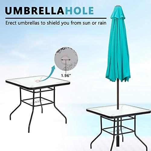 - ??Durable Construction?? The table is constructed from strong galvanized steel frame and tempered table top. There also a 1.57-inch hole allows to add the umbrella for shade. 4 chairs are made of heavy-duty steel frame and wicker.