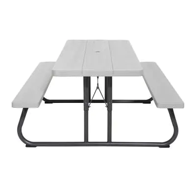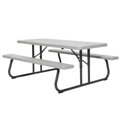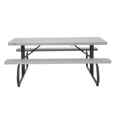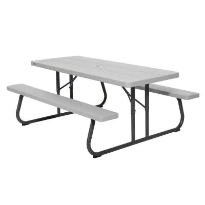 6-Foot Picnic Table ÿ The 72 in. x 30 in. high-density polyethylene tabletop is stain resistant, easy to clean, and folds flat for storage. This model comes in gray matters with a wood grain texture and a gray sand 1-5/8 in. round folding frame that includes an umbrella hole and cap. Single box packaging. 2-year limited warranty.