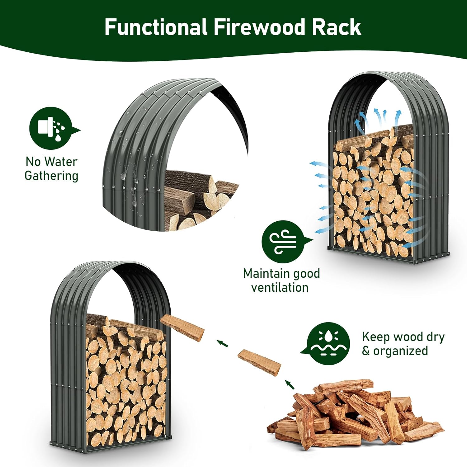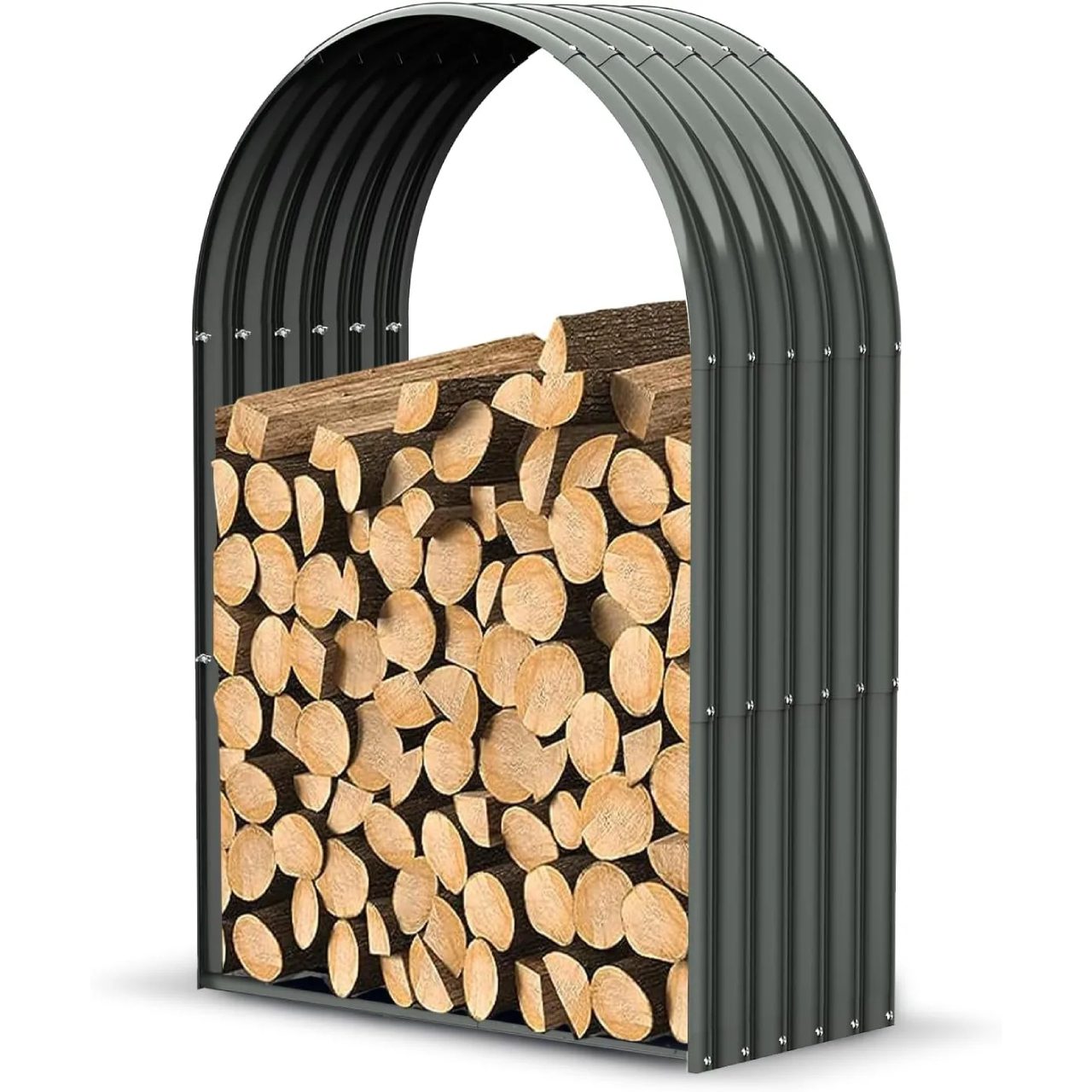 - Great for organizing and storing large wood piles, Creative shape wood racks outdoor for firewood with corrugated metal makes integrated wood holder and its maximum bear of cutting woods. Actively seasons and cures up to 1/2 face cord of firewood(20.25cube feet).