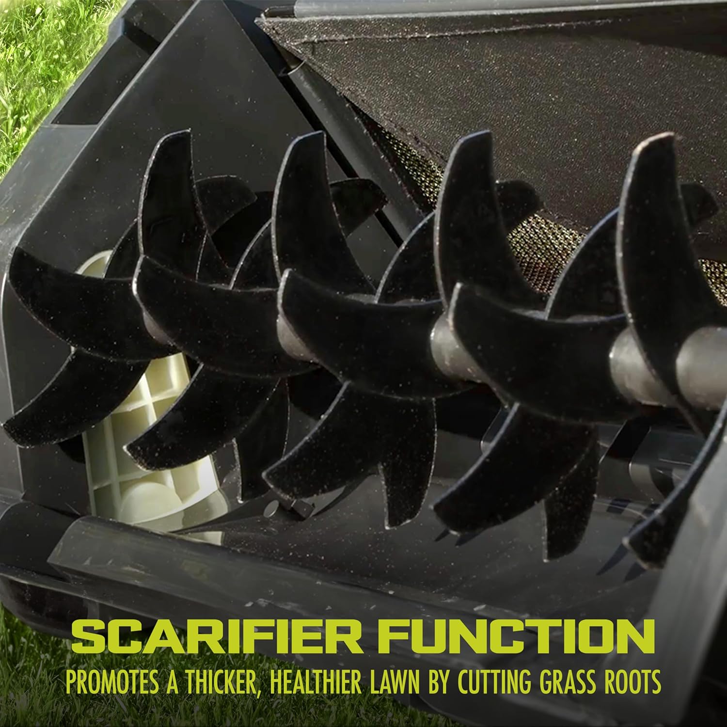 AJ805E 15-Inch 13-Amp Electric Dethatcher and Scarifier w/Removeable 13.2-Gal Collection Bag, 5-Position Height Adjustment, Airboost Technology Increases Lawn Health, Green