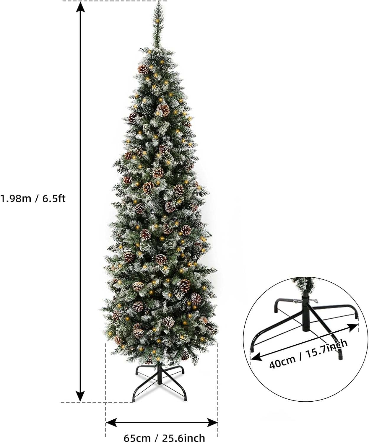 - Realistic Artificial Holiday Tree: This slim Xmas tree is 6.5/7.5 ft tall with a 25.6inch bottom diameter. This tree consists of multiple dense branch tips with lifelike needles, realistic snowflakes on the tips bring a strong winter feel to your decor. Number of Tips (6.5ft/7.5ft): 699/ 955.