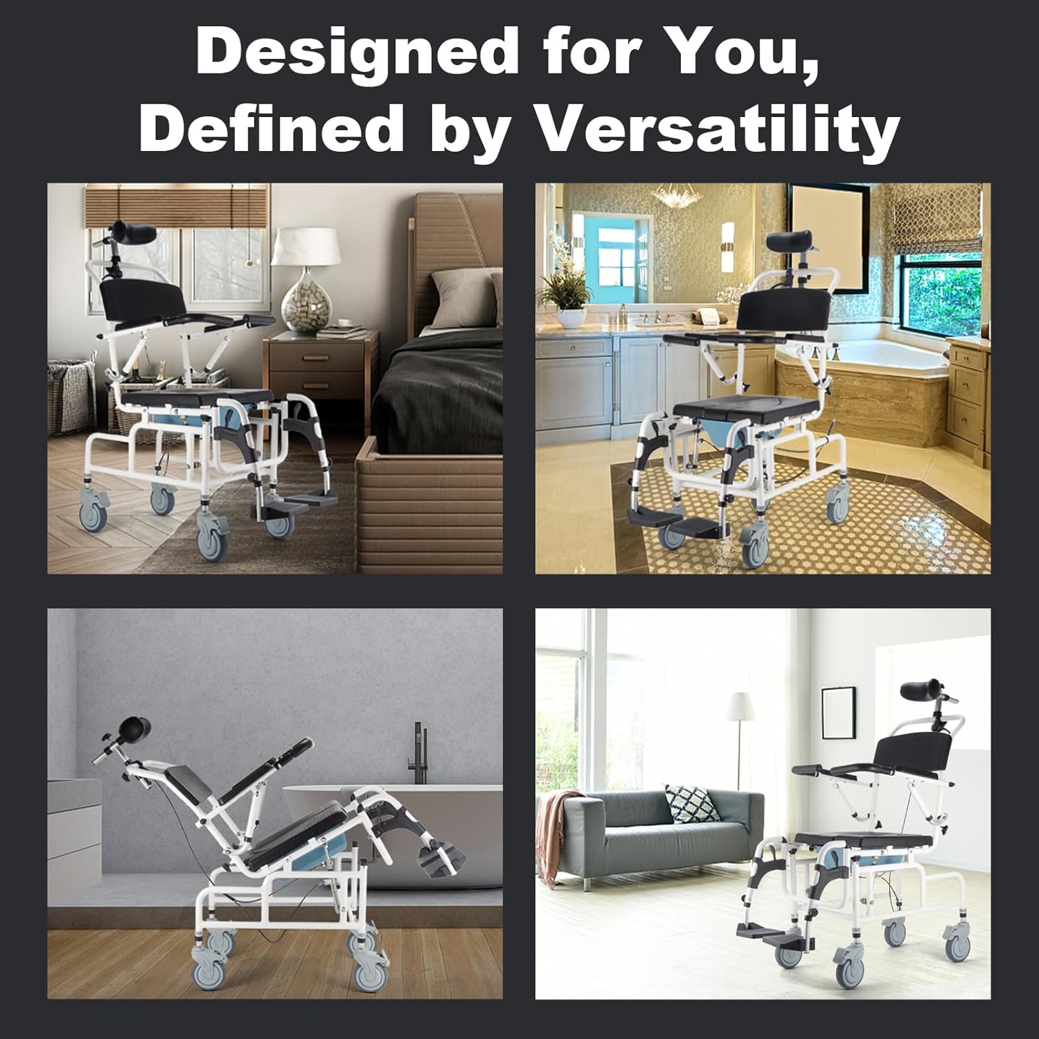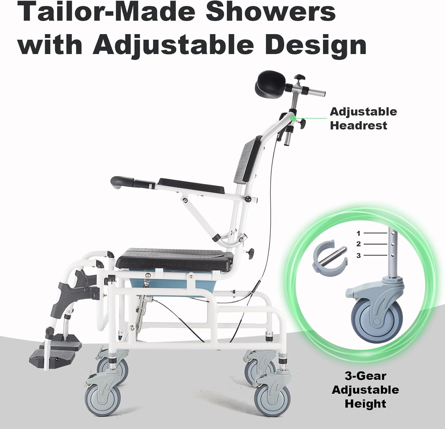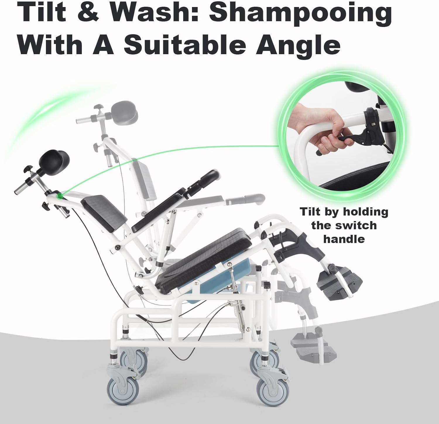 - Reclining Shampoo Wheelchair with Hydraulic Tilt: Featuring an adjustable headrest for sitting comfort, our shower chair with wheels is perfect for extended use. The shower wheelchair’s hydraulic lever simplifies tilting for caregivers, offering a maximum 30?? tilt angle. Semi-enclosed armrests promote user posture by preventing forward leaning