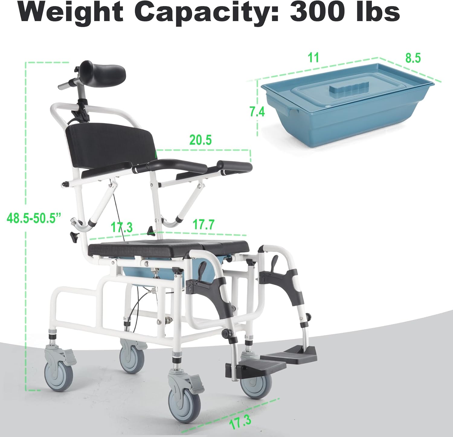 - 4 WHEEL BRAKES & ADJUSTABLE HEIGHT: Equipped with four quiet PVC swivel casters featuring brakes for smooth mobility and secure stops. Reclining wheelchair boasts an adjustable seat height ranging from 23 to 25 inches, catering to various user heights. With its robust frame, this rolling shower chair can confidently support up to 350 lbs