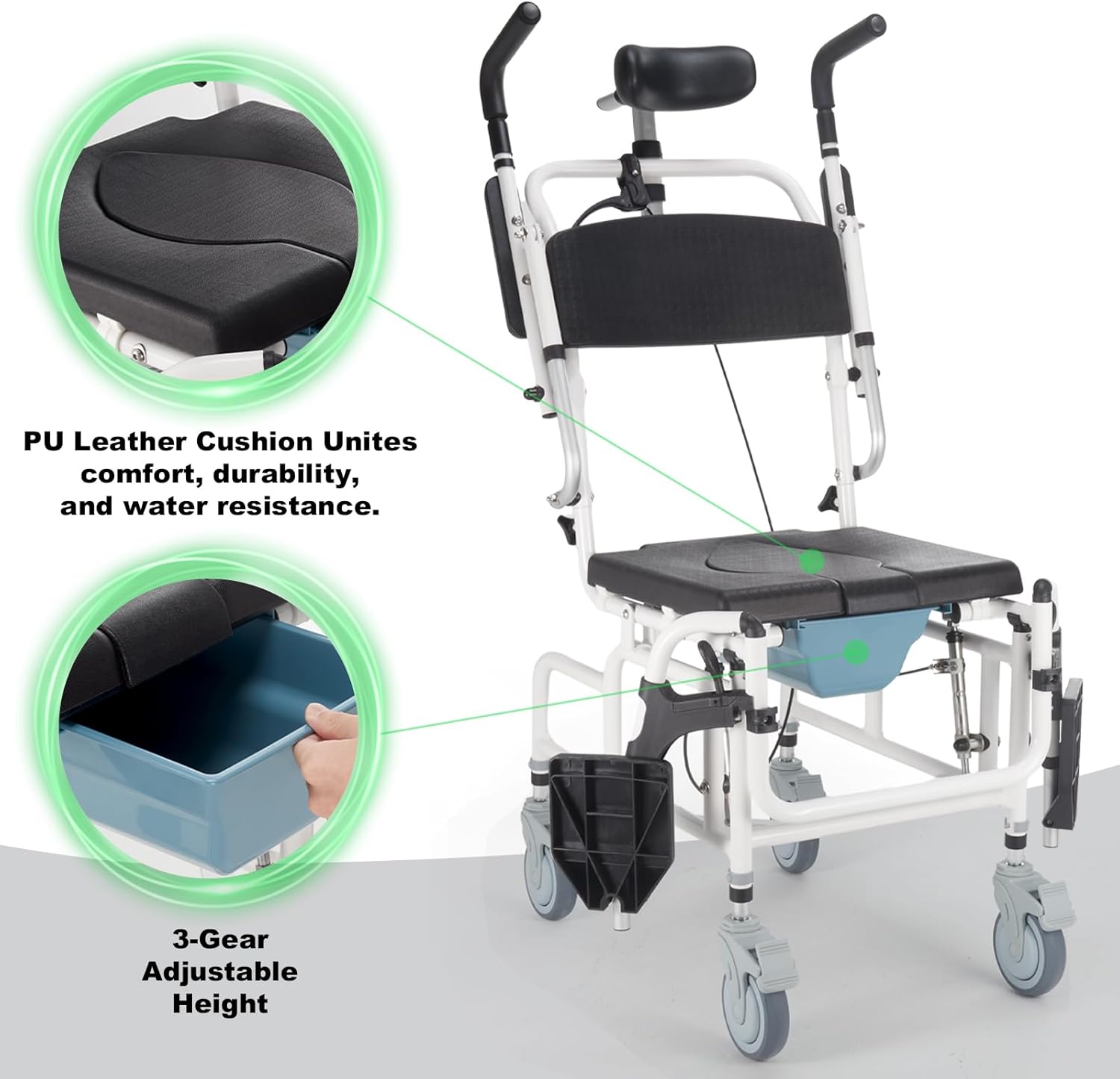 - PU Leather Seat & Rustproof Frame: Constructed with lightweight rustproof aluminum alloy, the frame of commode chair for toilet with arms ensures long-lasting durability. The PU leather padded seat, filled with high-density sponge, offers a waterproof surface that is easy to clean, enjoying comfort and hygiene for users of the shower wheelchair for elderly