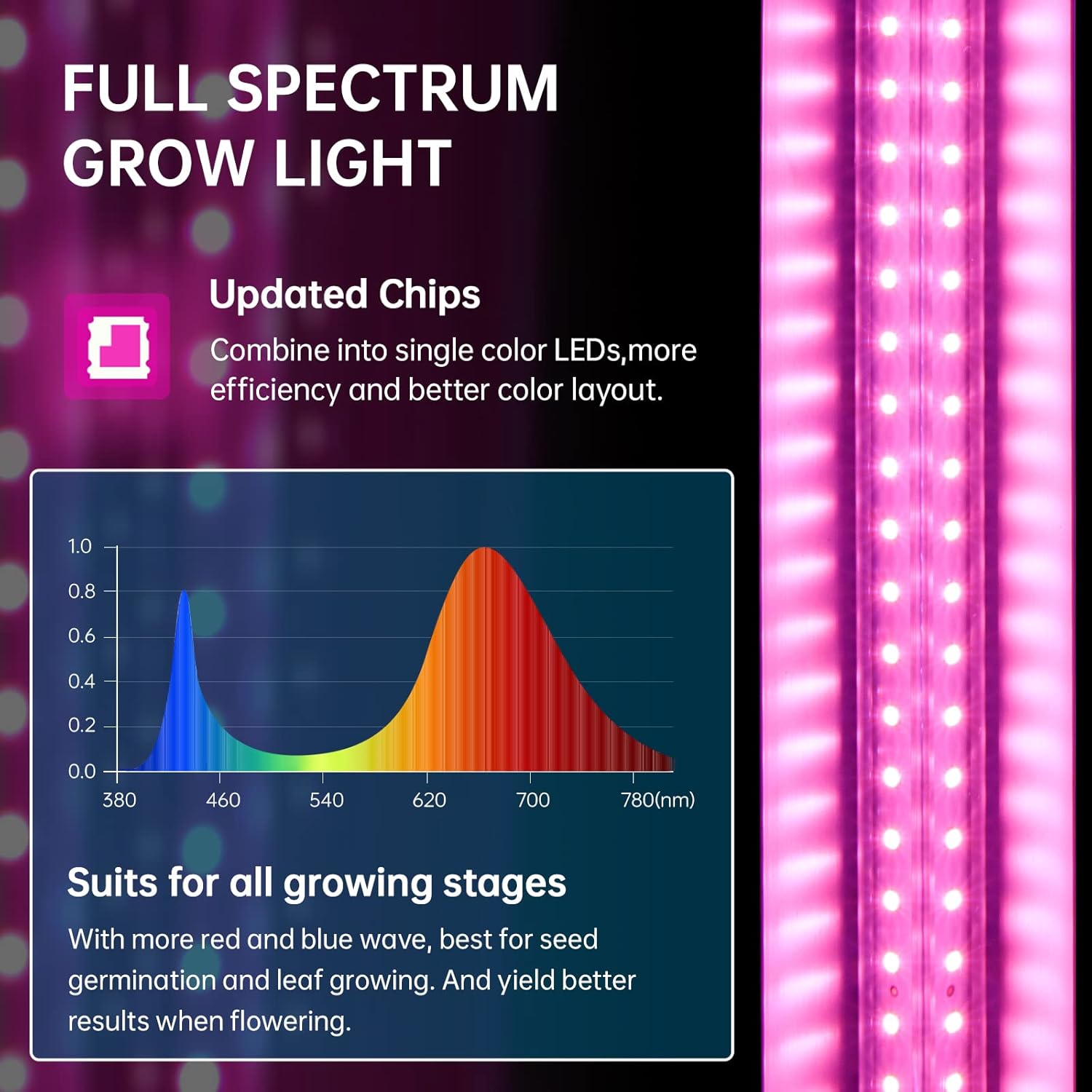 - Updated Plant Light Chips: Compare with other grow lights consisting of “blue chips” + “red chips”, these grow lights for indoor plants with integrated chips, which combined into one single color, allowing high efficiency and better color layout that irradiate more evenly for plants. It works extremely well for your plant grow tents, plant grow shelves, seedling cultivation, succulents, hydroponic rooms, greenhouses, etc