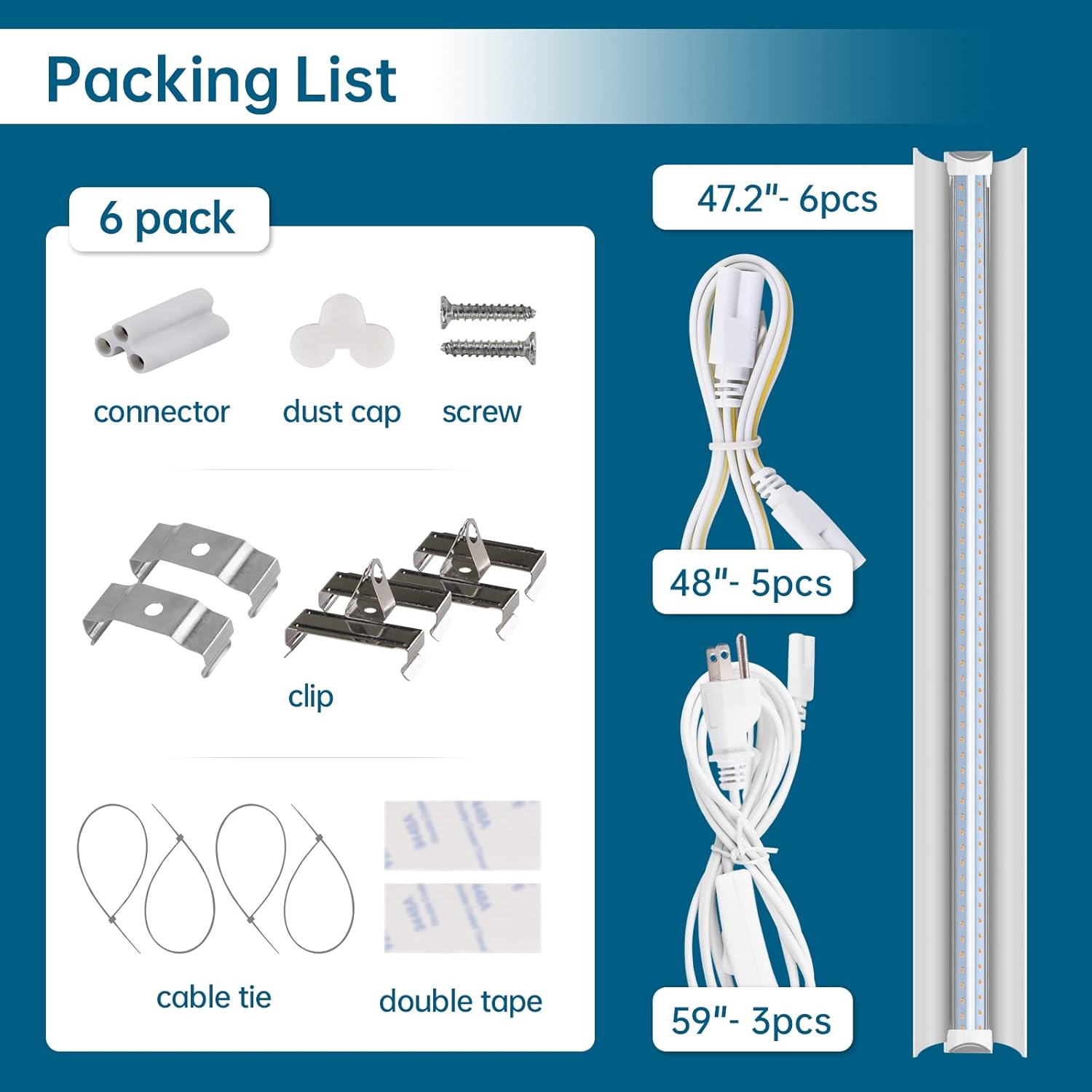 - What You Get: 6 x Barrina LED Grow lights, 3 x Power cords with ON/OFF switch, 5 x Connecting Cords(48”), 6 x Small Connectors, 24x Installation Clips, 12 x Tapes, 24 x cable ties