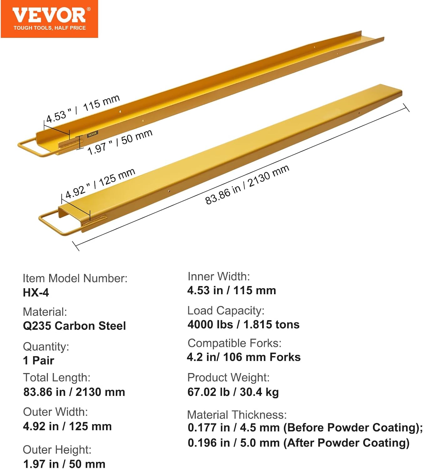 - Fit For 4.3 Inches Forklifts: The forklift extensions are 84” in length, 4.5” in inside width, ideally suitable for 4.3″ width pallet forks. They extend the size of the original forks, giving more space to fork cargoes at one time. The large weight capacity makes it capable of undertaking most lifting tasks in a warehouse or building site.