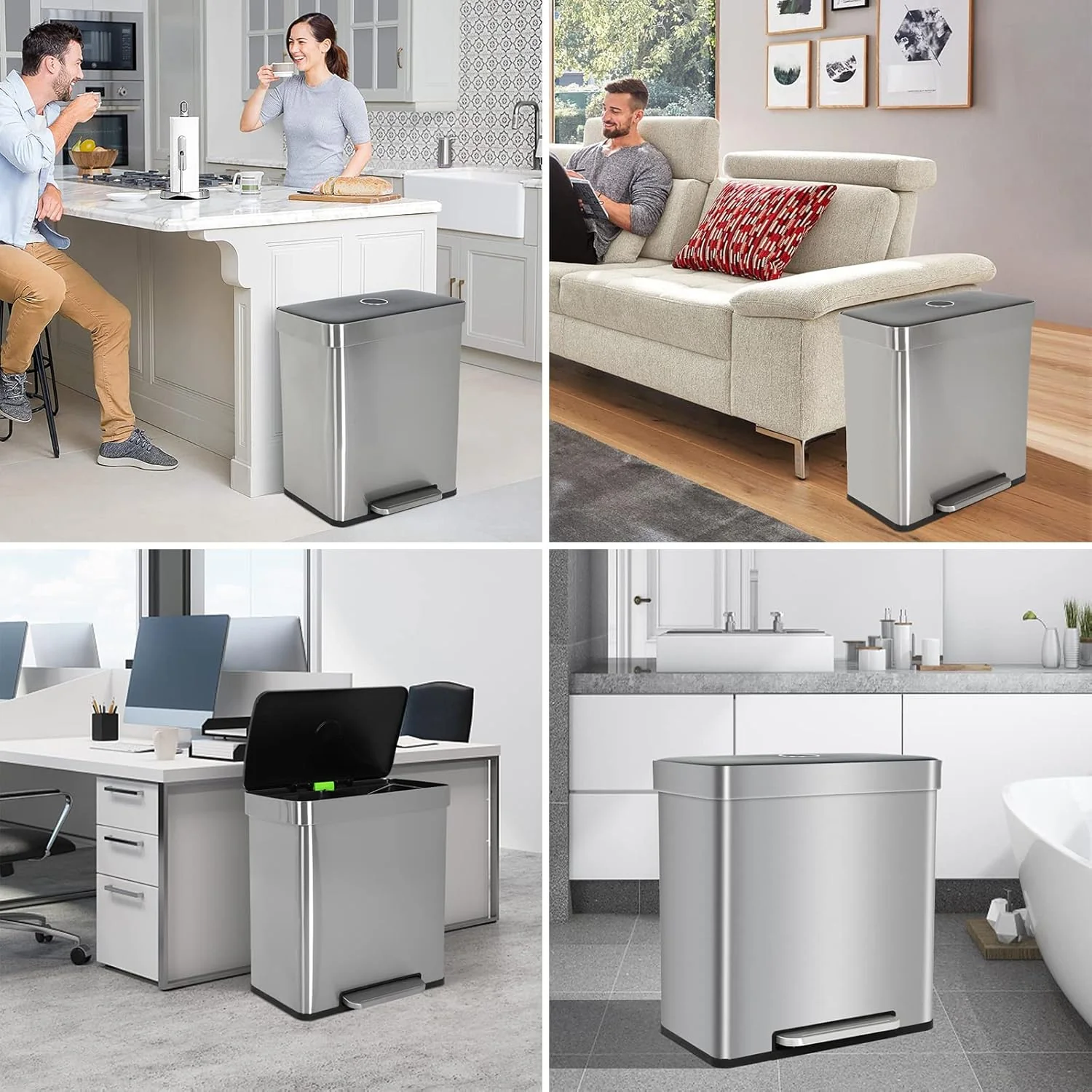 - ?[STRONG &FASHIONABLE APPEARANCE ] – Our kitchen trash can is made of high quality stainless steel with a stainless steel wire drawing surface. The oval body with a sloping lid makes the Garbage Can look even more cool and beautiful. Buying our stainless steel trash bin is a great deal for you.