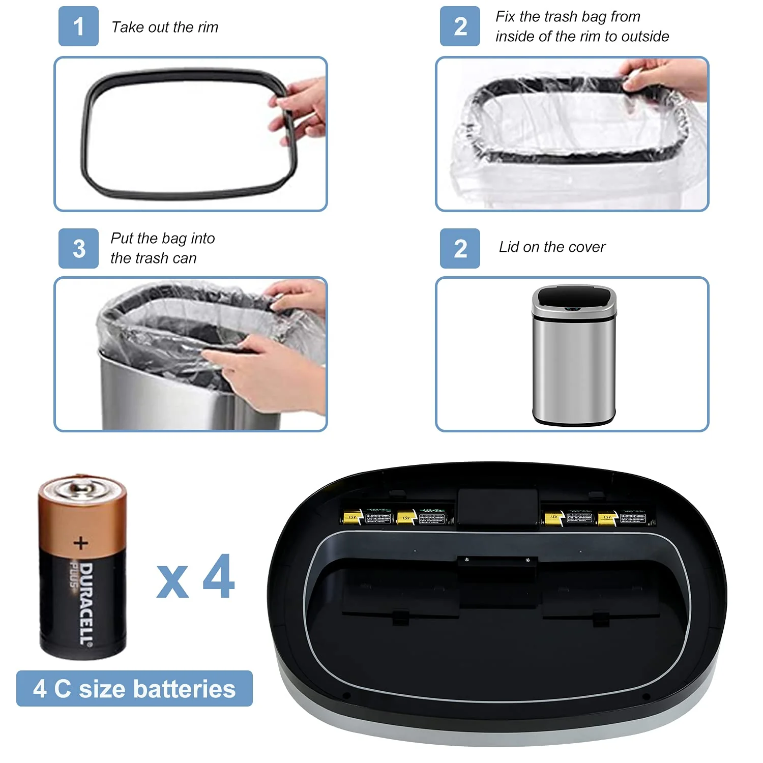 - ?[100% AUTOMATIC] – Trash uses infrared technology.Powered by 4 C batteries(not included). When an object approaches the trash can,Hands-free operation lid opens within 0.3 seconds when in range of the sensor, and the lid will automatically close after staying for 7 seconds.