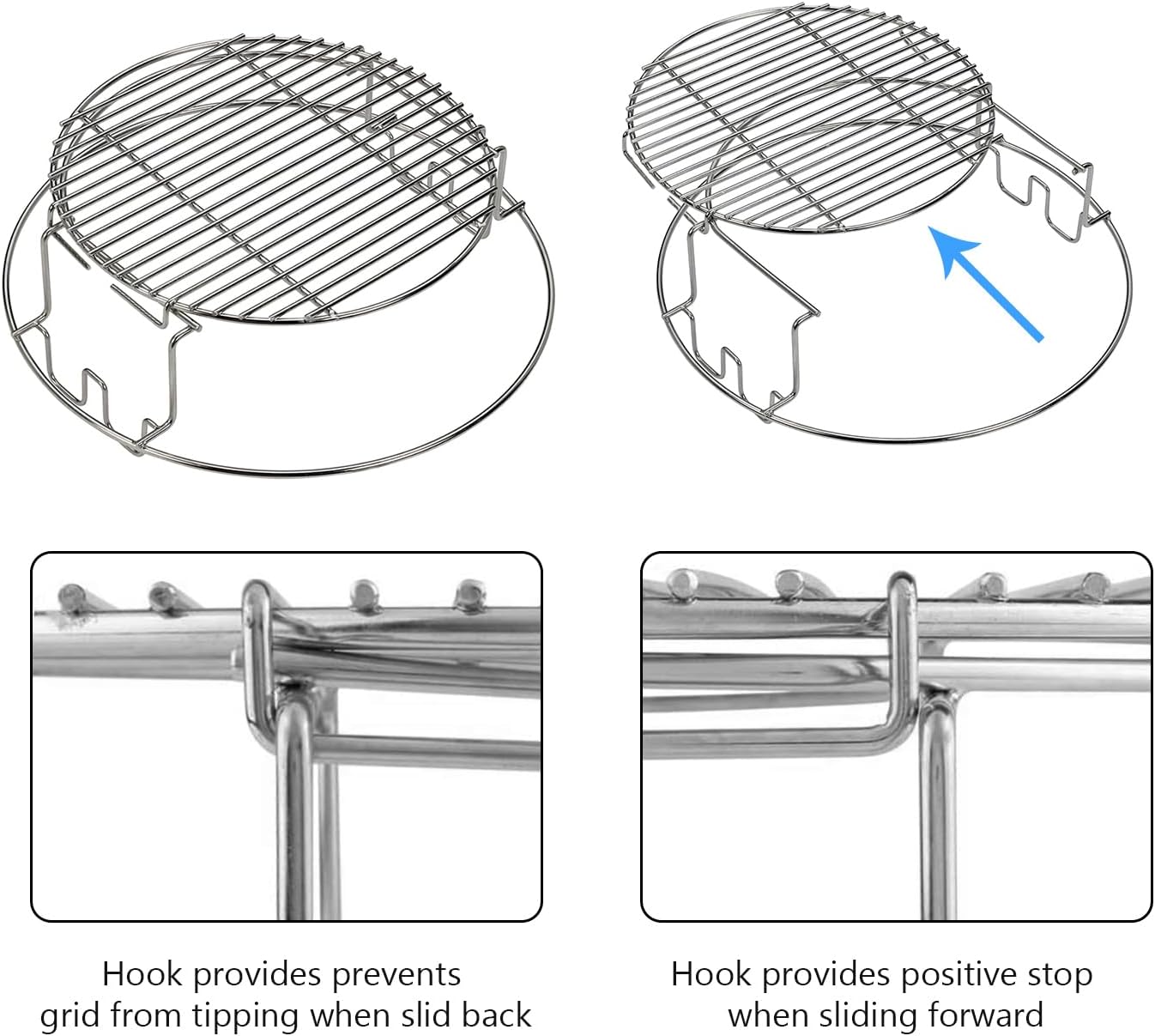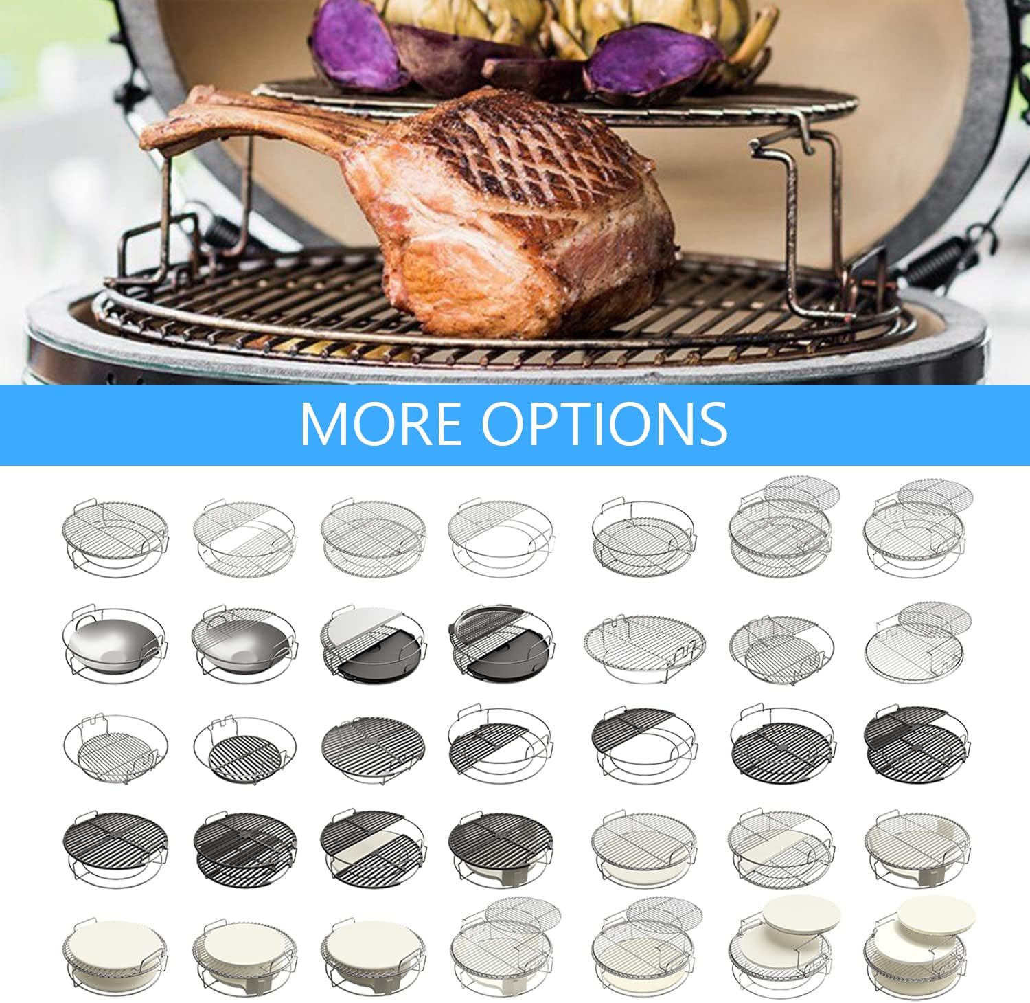 - The Kit is easily configured for multi-level direct and indirect cooking, a raised and sliding grid with a height of 10 cm for easy accessibility, the sliding top rack offers easy access to the food on the main grate, direct “Cowboy Style” lower rack cooking and useful as a convEGGtor Basket;