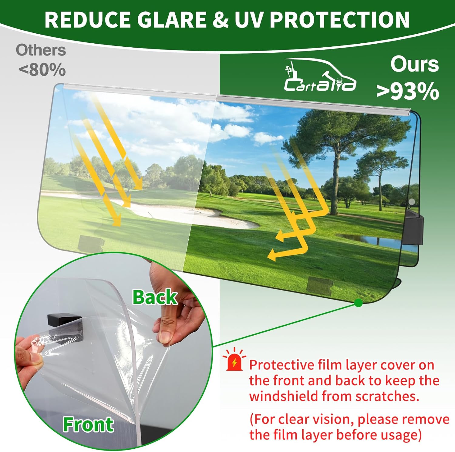 - Protective Packing: Comes with protective foam packing to prevent damage in transit and protective film to prevent scratches on glass. Please remember to remove the film after installing ezgo golf cart windshield replacement.