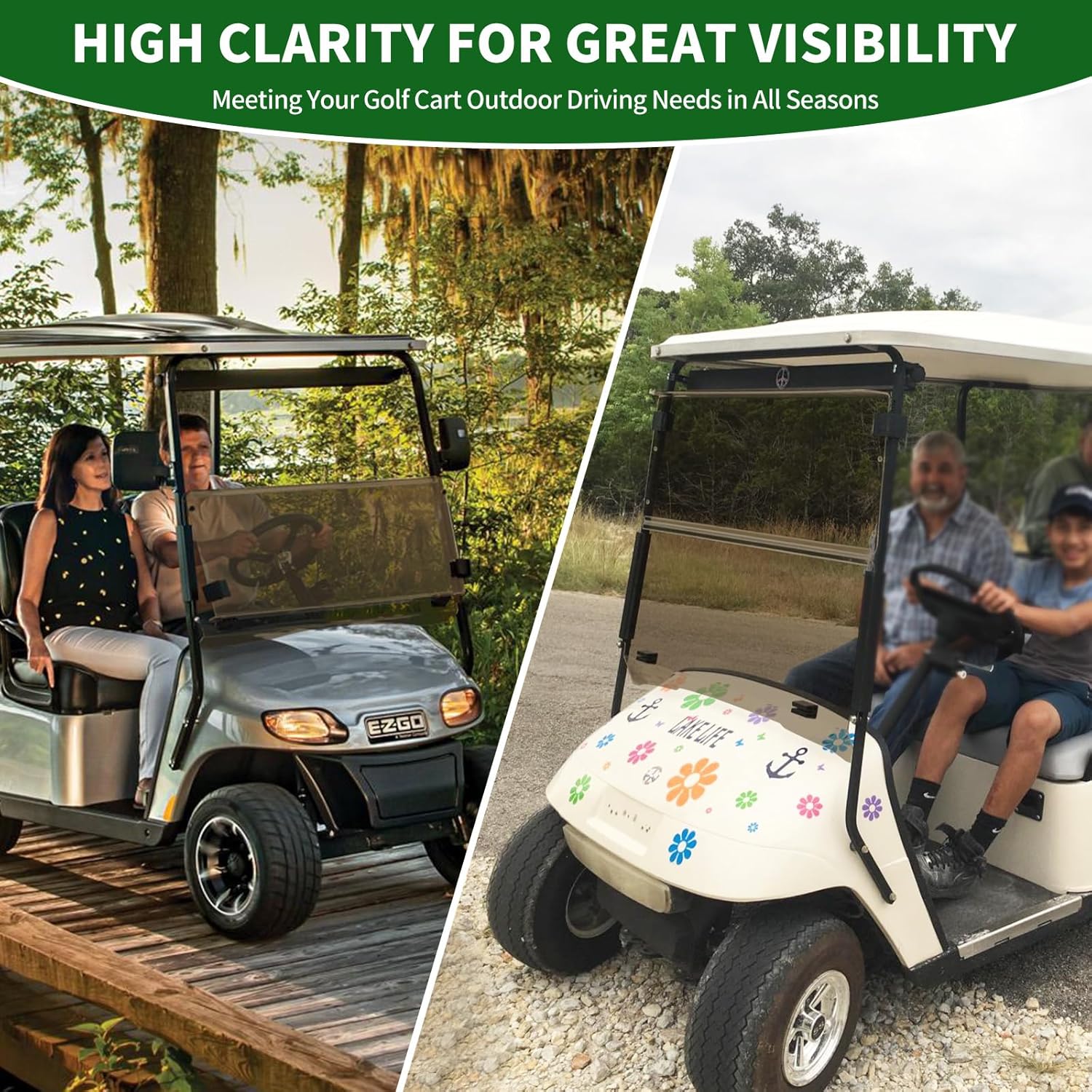 - Great Visibility In All Seasons: The ezgo windshield for golf cart is sophisticated made, features reduce glare and UV protection. It’s good for protecting passenger against windstorms, dust, twigs, ensure more driving outdoors safety when under changing weather.