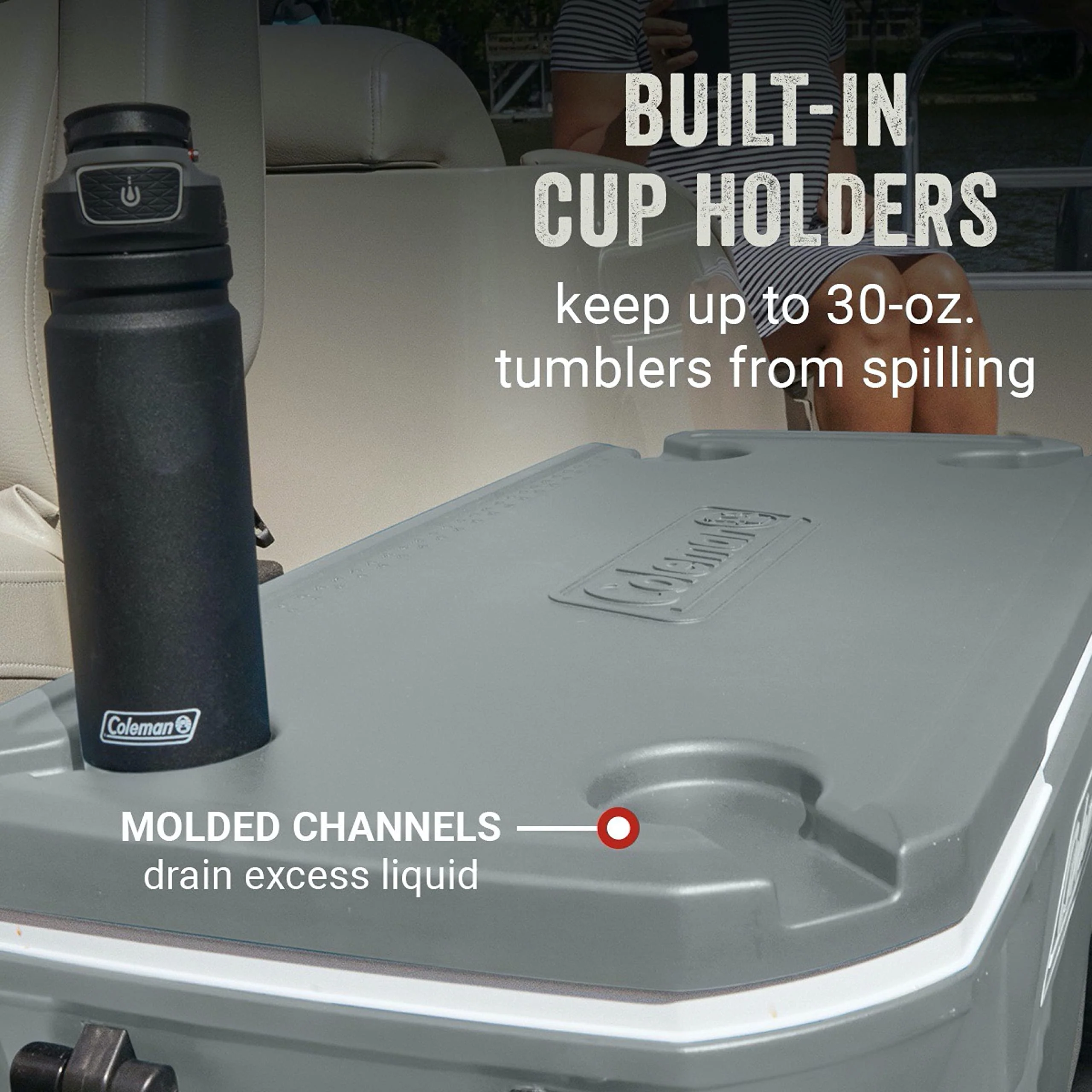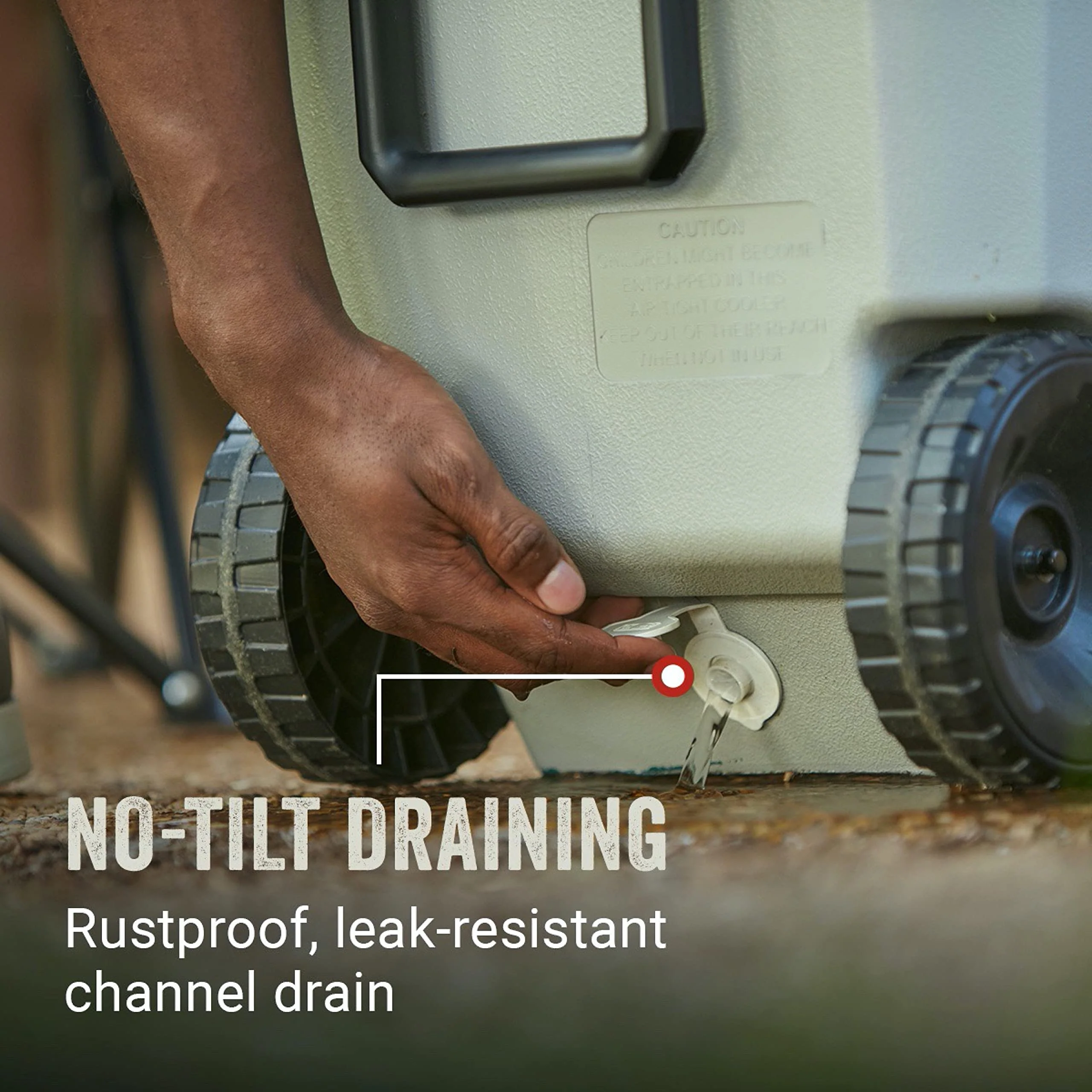 FULLY INSULATED: Lid and body Keeps the Ice up to 5 days in temperatures as high as 90??F; logo color on cooler may vary FOR THE LONG HAUL: Heavy-duty 6-inch wheels and durable tow & swing-up handles designed for easy transport CUP HOLDERS WITH DRAIN: Molded into the lid to keep drinks from spilling; fit up to a 30-oz. tumbler HAVE-A-SEAT LID: Closed lid supports up to 250 lbs. STAIN-RESISTANT LINER: For easy cleanup; leakproof channel drain plug EASY TO OPEN: Recessed lip for easier access to contents LARGE CAPACITY: Holds up to 160 cans LEAKPROOF: Channel drain plug Technical Details