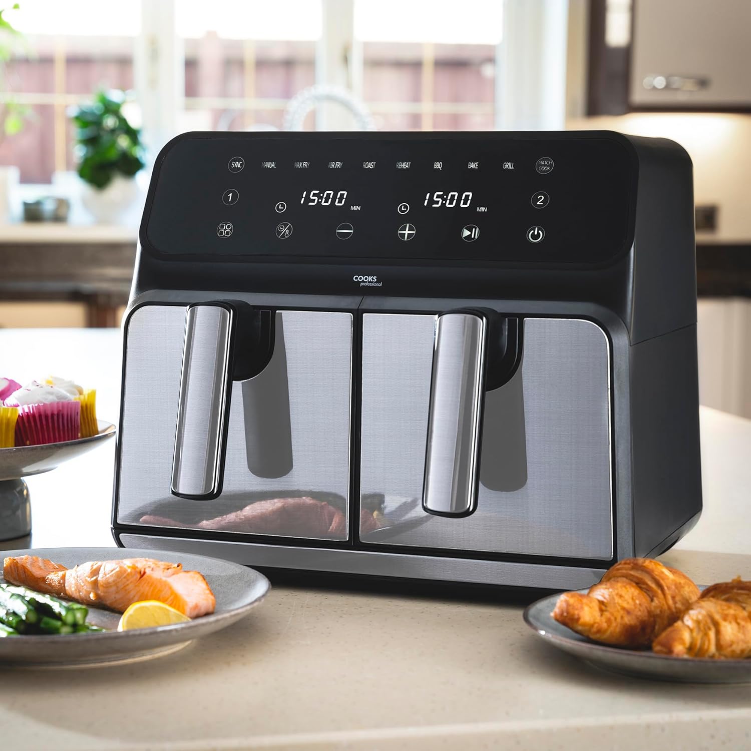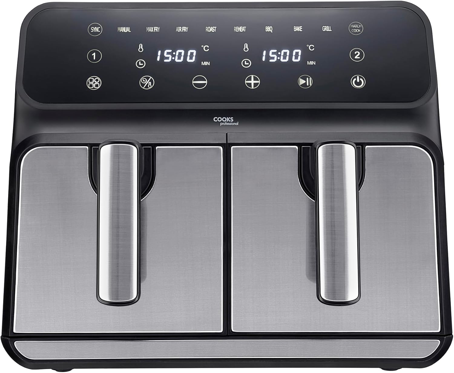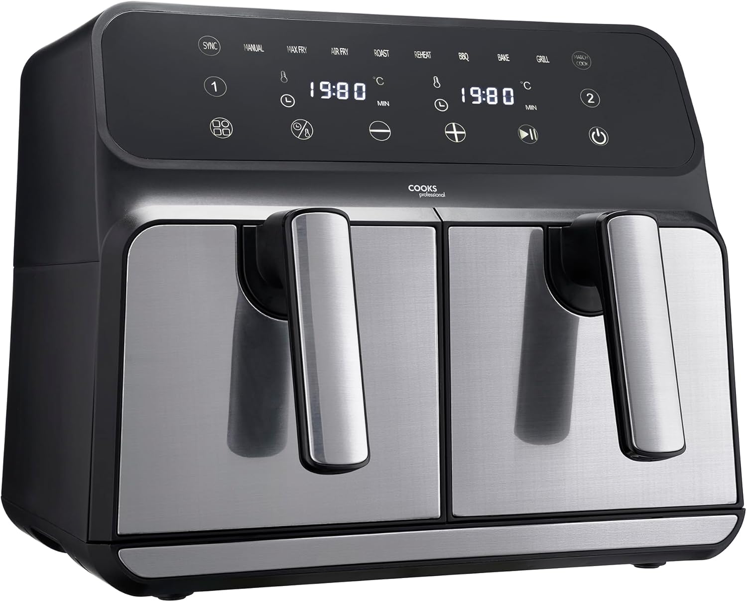 - FEAST FOR THE FAMILY: Effortlessly feed the entire family with a 2 drawer air fryer’s impressive 8L capacity. With fast air circulation for even cooking, smart syncing and matching cooking options, you can prepare large, satisfying meals with ease in Cooks Professional stainless steel air fryer dual basket.