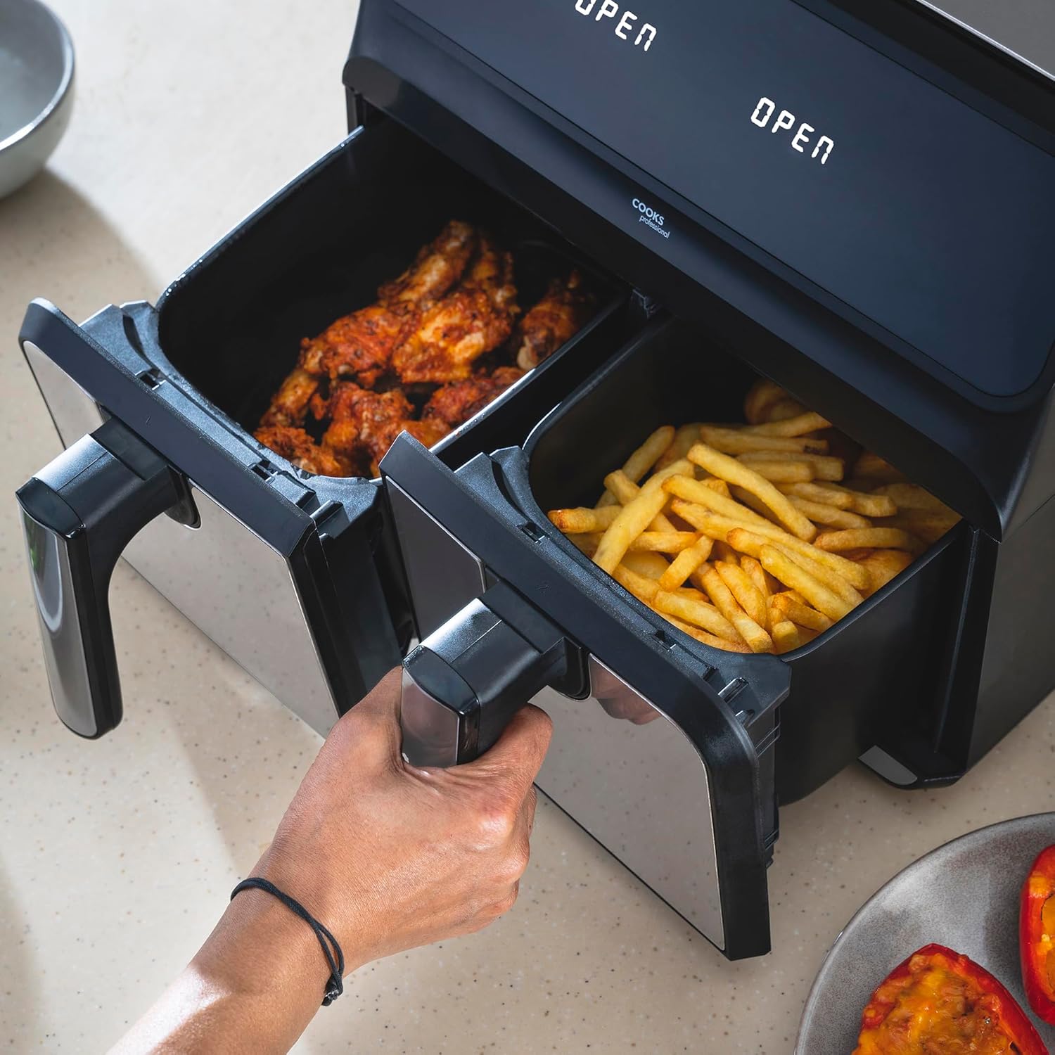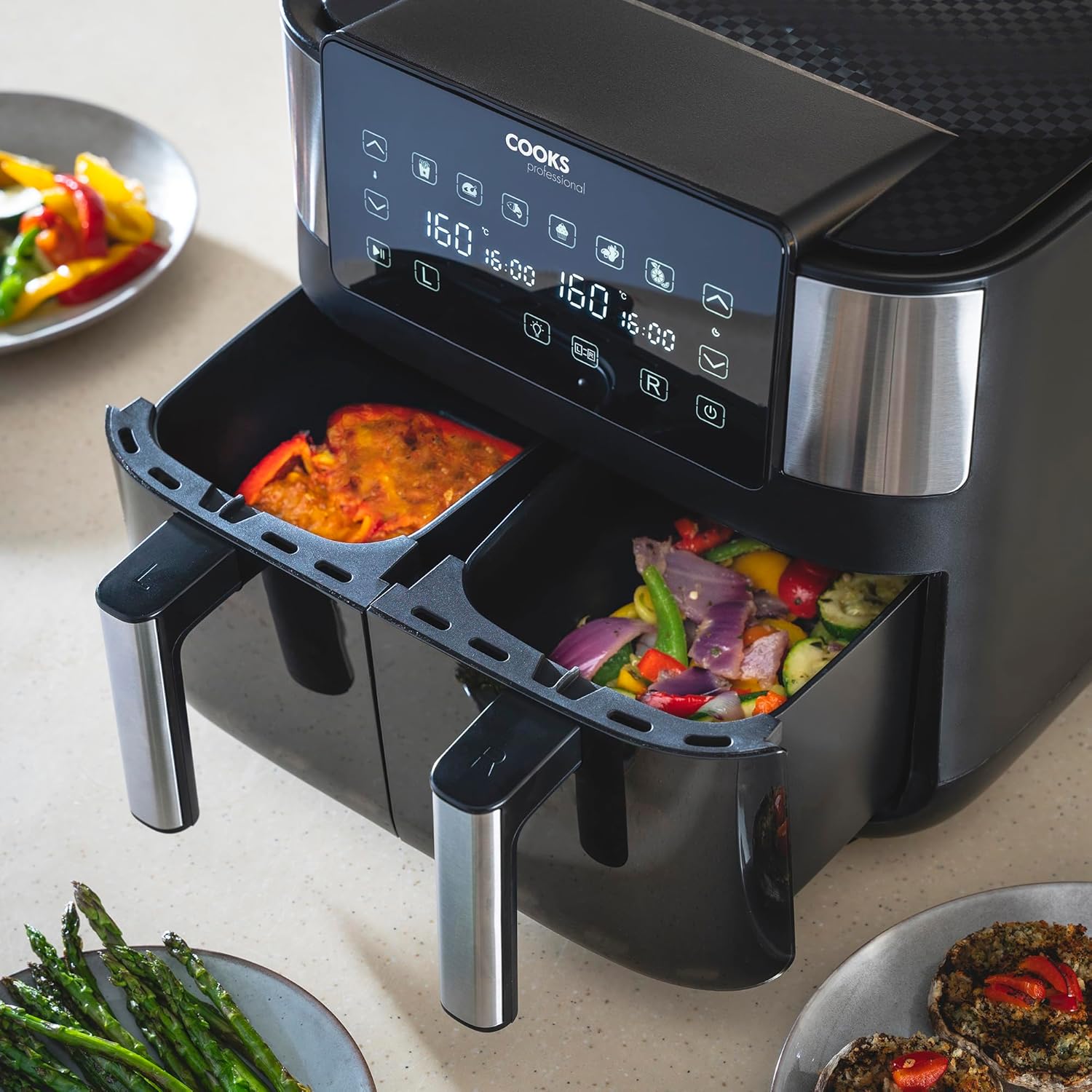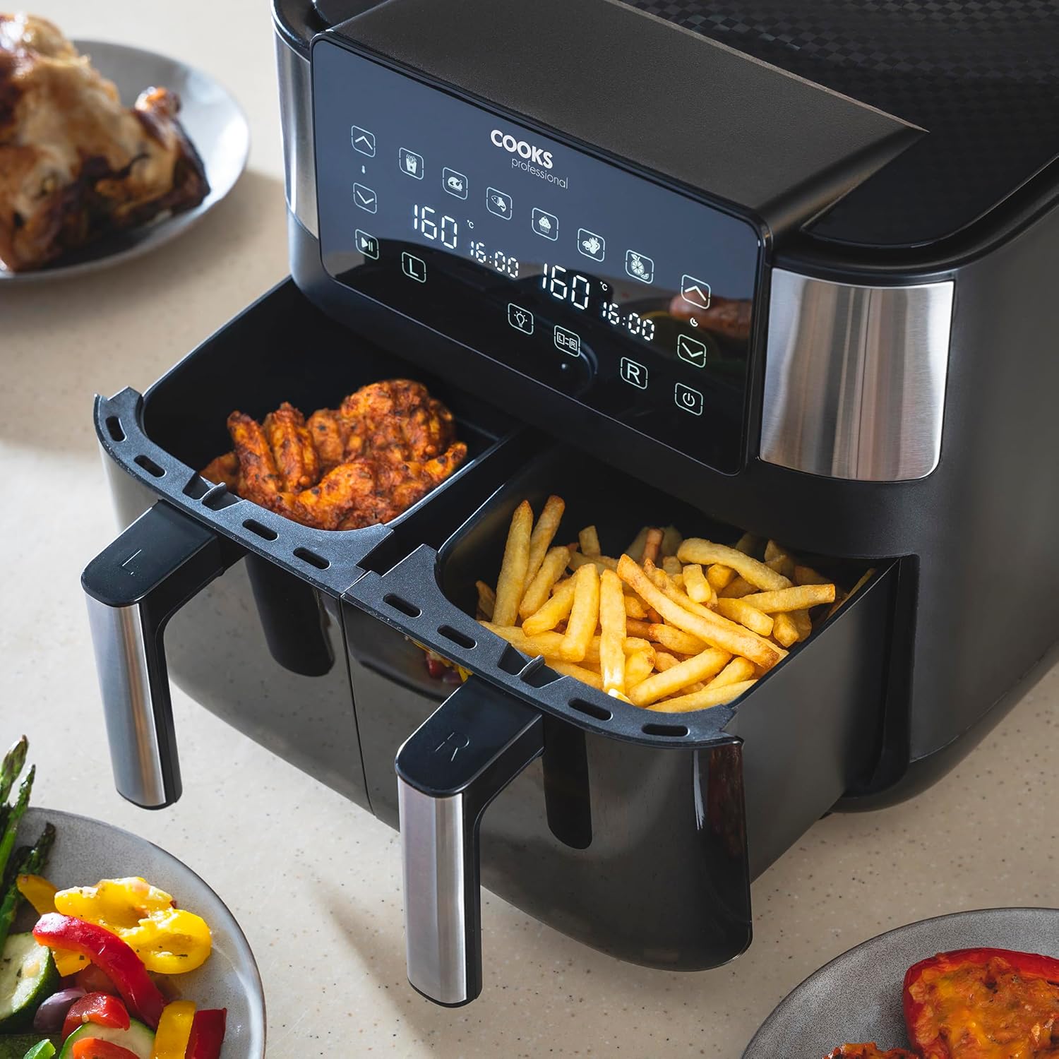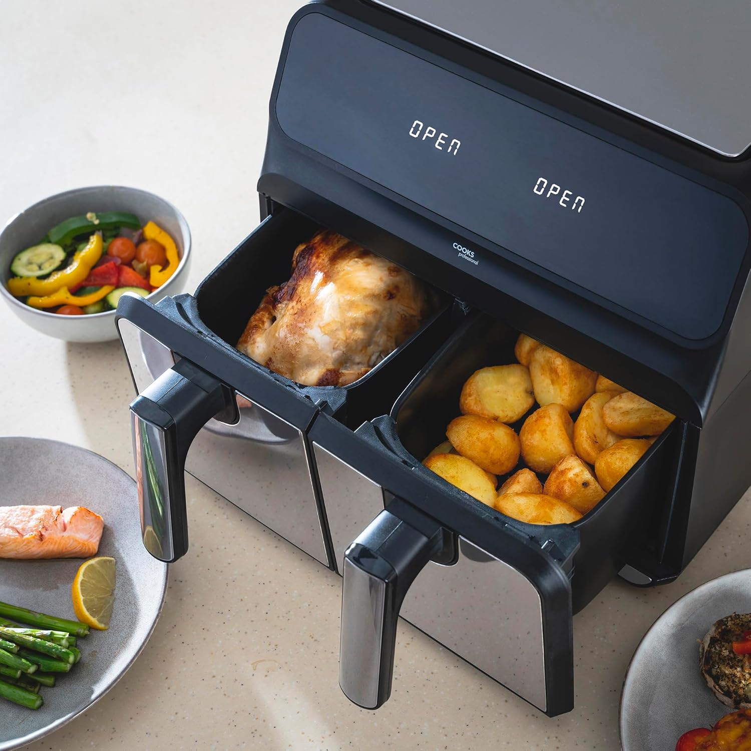 - FEAST FOR THE FAMILY: Effortlessly feed the entire family with a 2 drawer air fryer’s impressive 8L capacity. With fast air circulation for even cooking, smart syncing and matching cooking options, you can prepare large, satisfying meals with ease in Cooks Professional stainless steel air fryer dual basket.