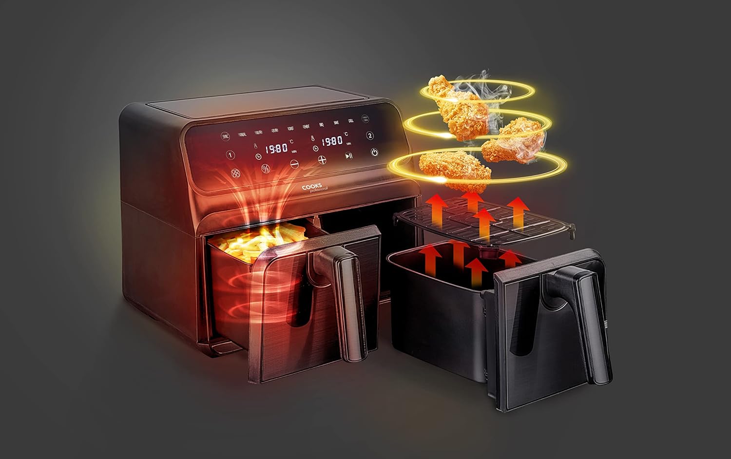 - ENERGY-SAVING MARVEL: Cooks Professional dual air fryer trims your electricity bills, thanks to its energy-saving technology. With cutting-edge digital display and customizable settings, the double drawer air fryer becomes the embodiment of culinary excellence and energy-saving prowess.