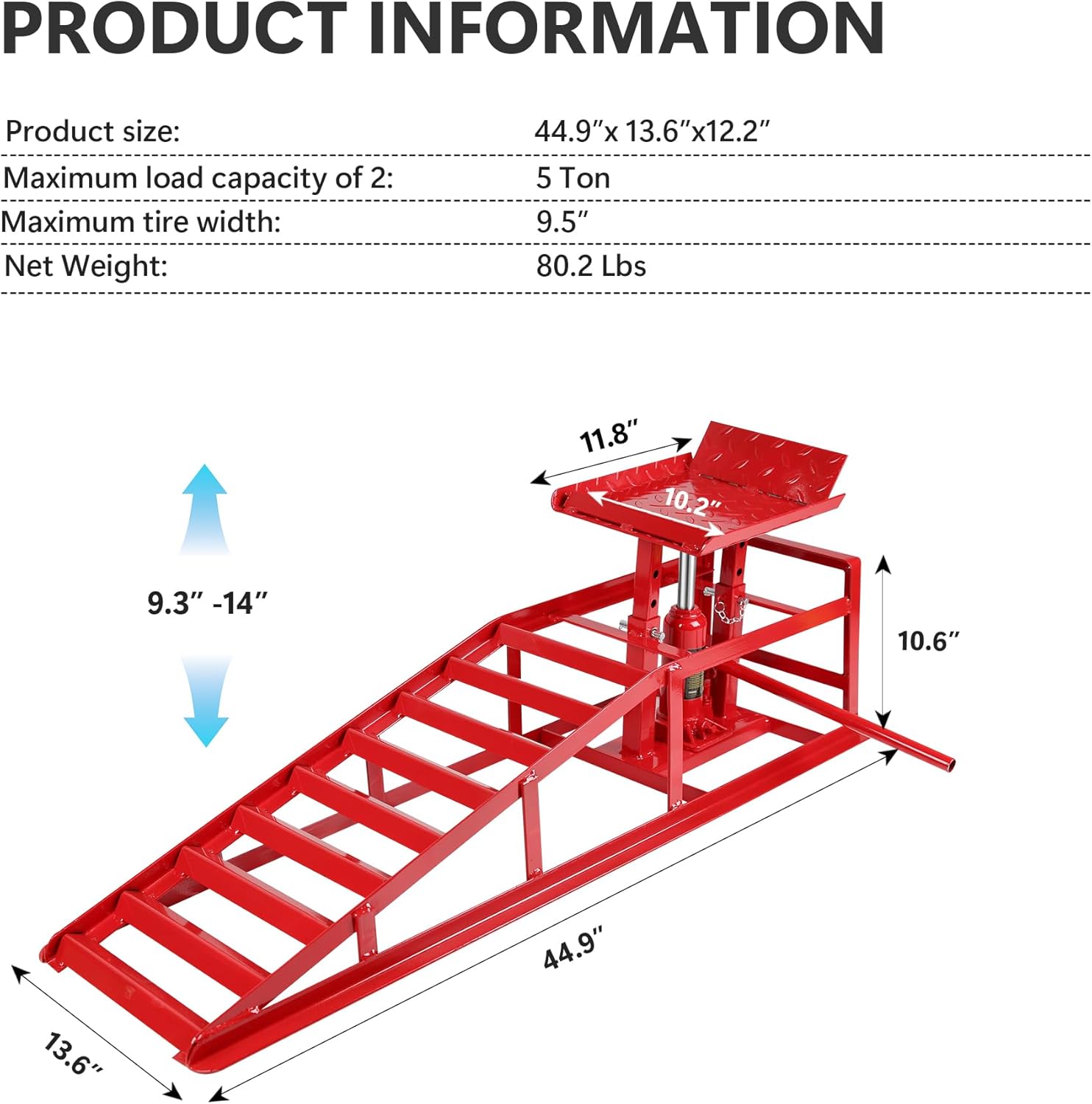 - Exceptional Load-Bearing Capacity: Our hydraulic car ramps boast an impressive load-bearing capacity of up to 5 tons (11,000 lbs), making them ideal for supporting most cars and light trucks. Whether for routine maintenance or professional repairs, you can use them with confidence, ensuring the safety of your vehicle.