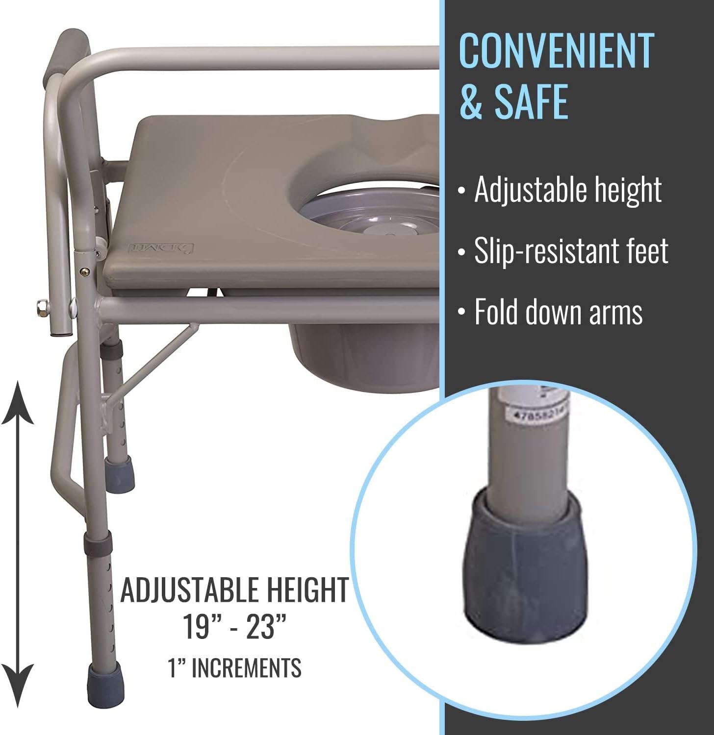 - BEDSIDE COMMODE CONVENIENTLY ADJUSTS IN HEIGHT from 19 to 23 inches in 1 inch increments. The extra wide platform maximizes stability and safety. The width between the toilet safety frame arms is 26 inches and width between the legs is 26.5 inches, the depth is 18.5 inches and the commode chair weighs only 19 pounds