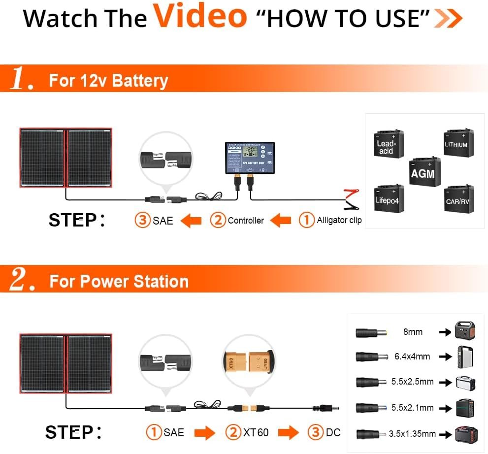 - ??PERFECT CHOICE FOR OUTDOOR AND EMERGENCY LIFE??– 9.85ft (3m) cable length from panel to controller, For most power stations (Jackery,Goal Zero,Ecoflow,Paxcess) and 12-volt batteries(AGM,LiFePo4,Deep cycle batteries),RV,car,boat,trailer,truck,pumpa,camping,van,emergency power