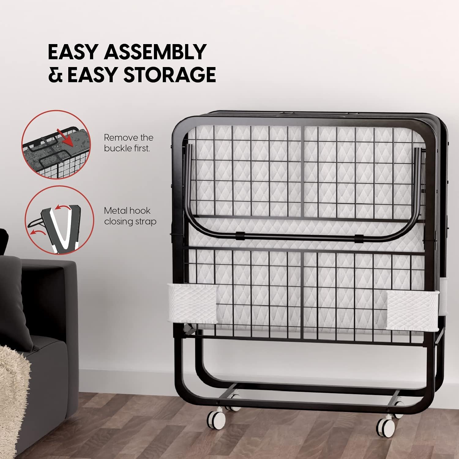 - Quick & Easy Assembly – Set up the folding bed with mattress for adults in 7 simple steps! Our portable folding bed comes with a manual, tools, and screws. We recommend having 2 people set it up.