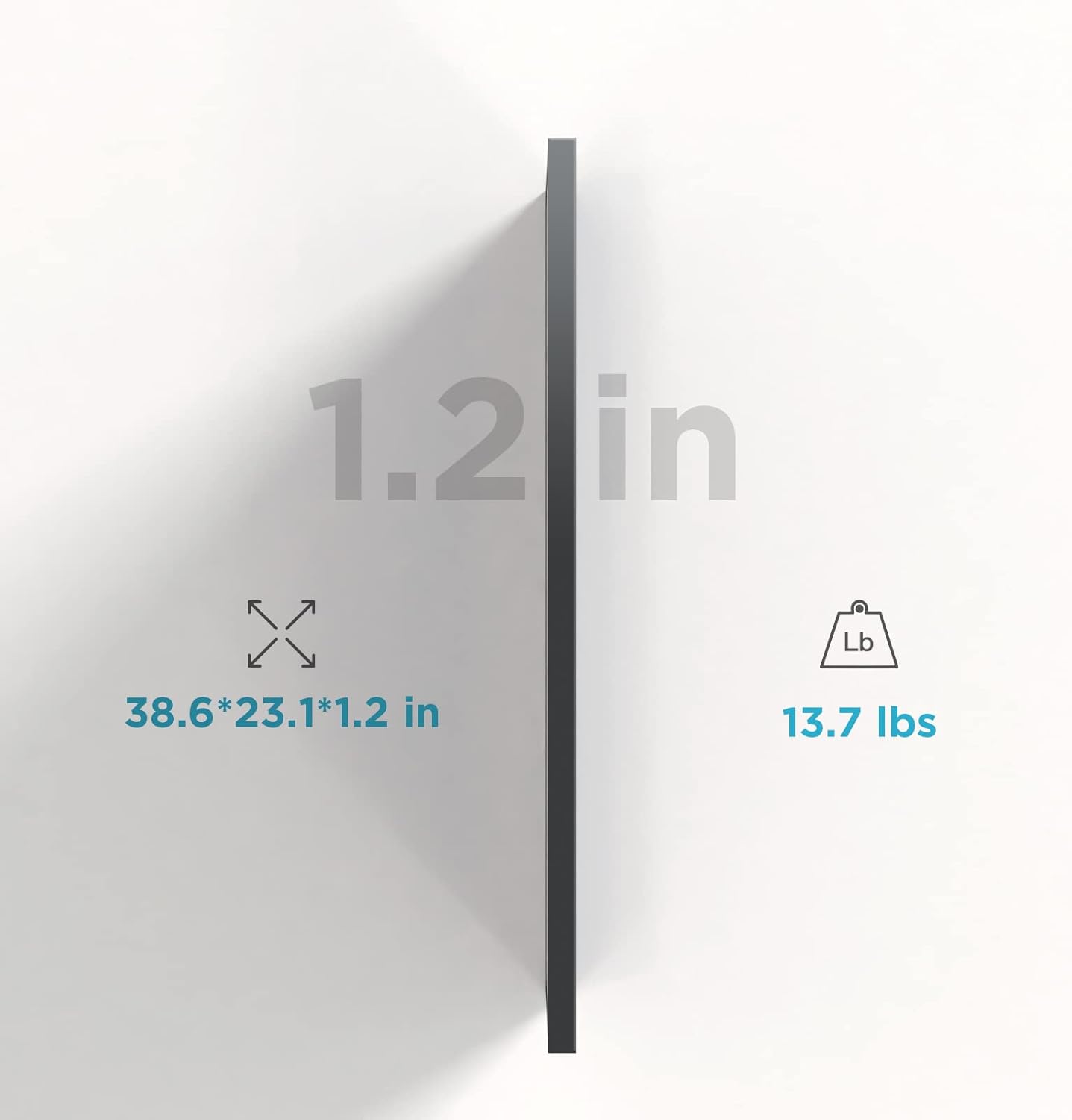 - General Specifications-size: 38.6*23*1.2 Inch, single solar panel weight: 13.6 lb. Produce an average of 400-500 Watt-hours (Wh) or 35-45 Amp-hours (Ah) of electricity per day (depending on sun availability).