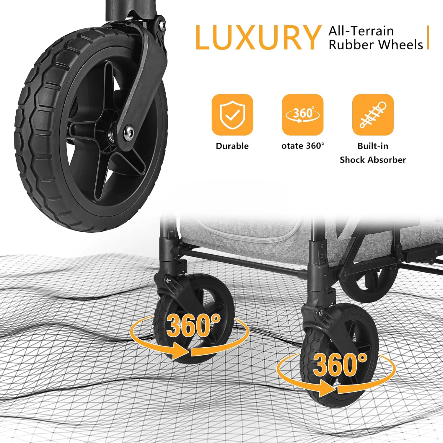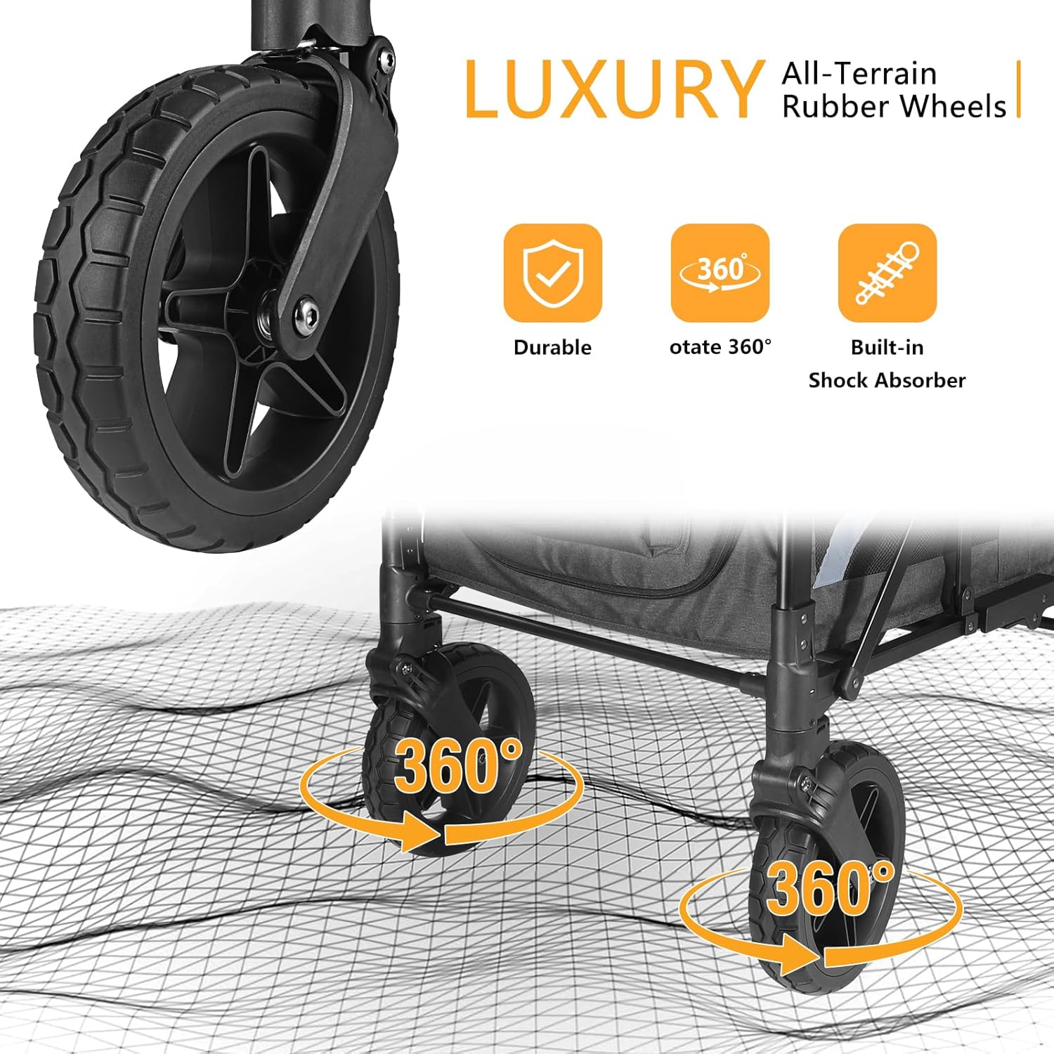 - Effortless All-Terrain Maneuverability: Tackle any terrain with ease! The 360?? swivel front wheels and rugged rubber tires handle grass, sand, or uneven sidewalks with ease. The adjustable dual handlebars allow you to push or pull comfortably, ensuring smooth control no matter where your adventures take you