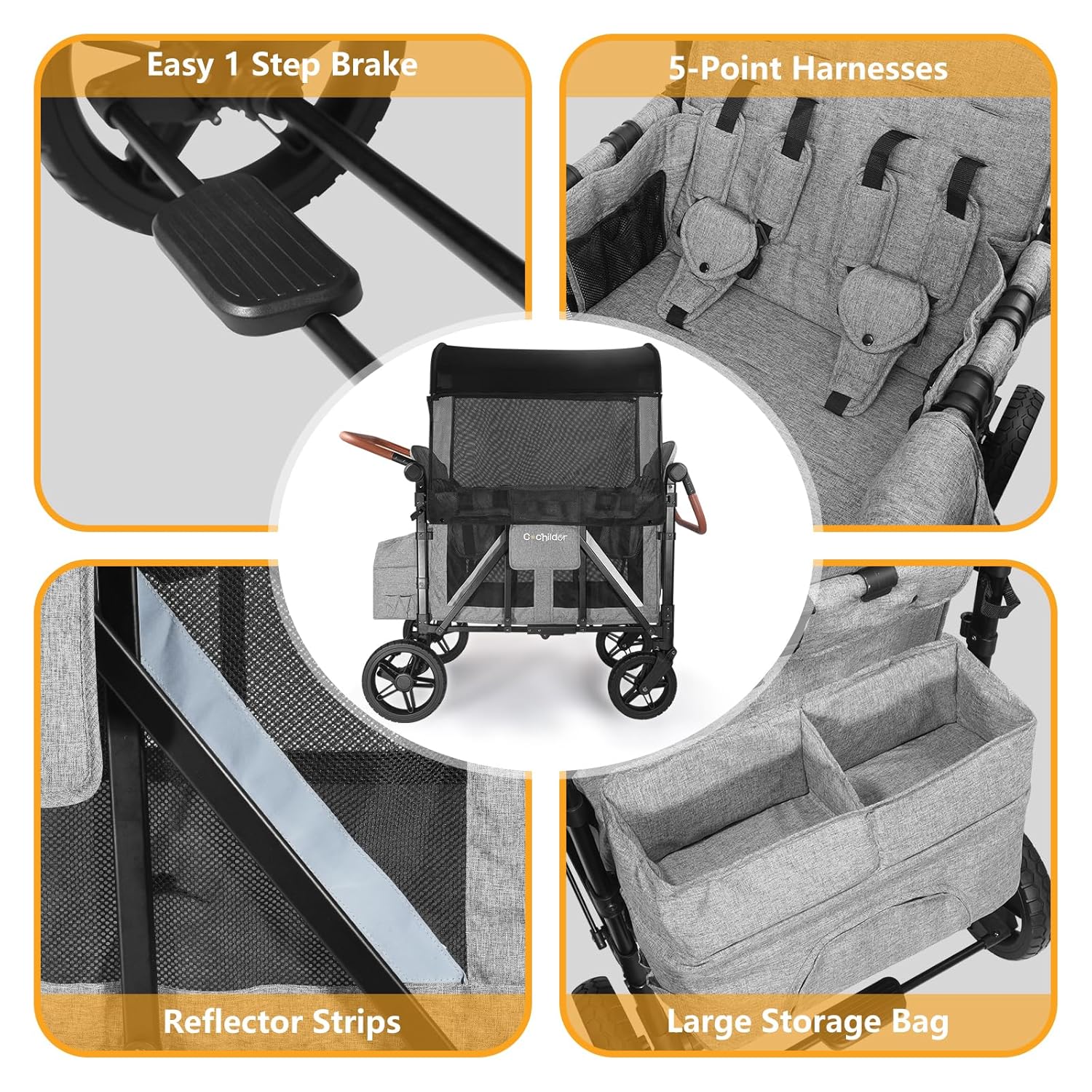 - Safety & Comfort for Every Child: Your kids?? safety and comfort are a top priority. Each of the 4 high seats features a 5-point adjustable safety harness with 3 height positions, ensuring a secure and comfortable fit for children of all sizes. The one-step parking brake provides added security, while the adjustable canopy offers UV protection. The mesh panels in the carriage ensure optimal airflow, keeping kids cool and comfortable during long outings