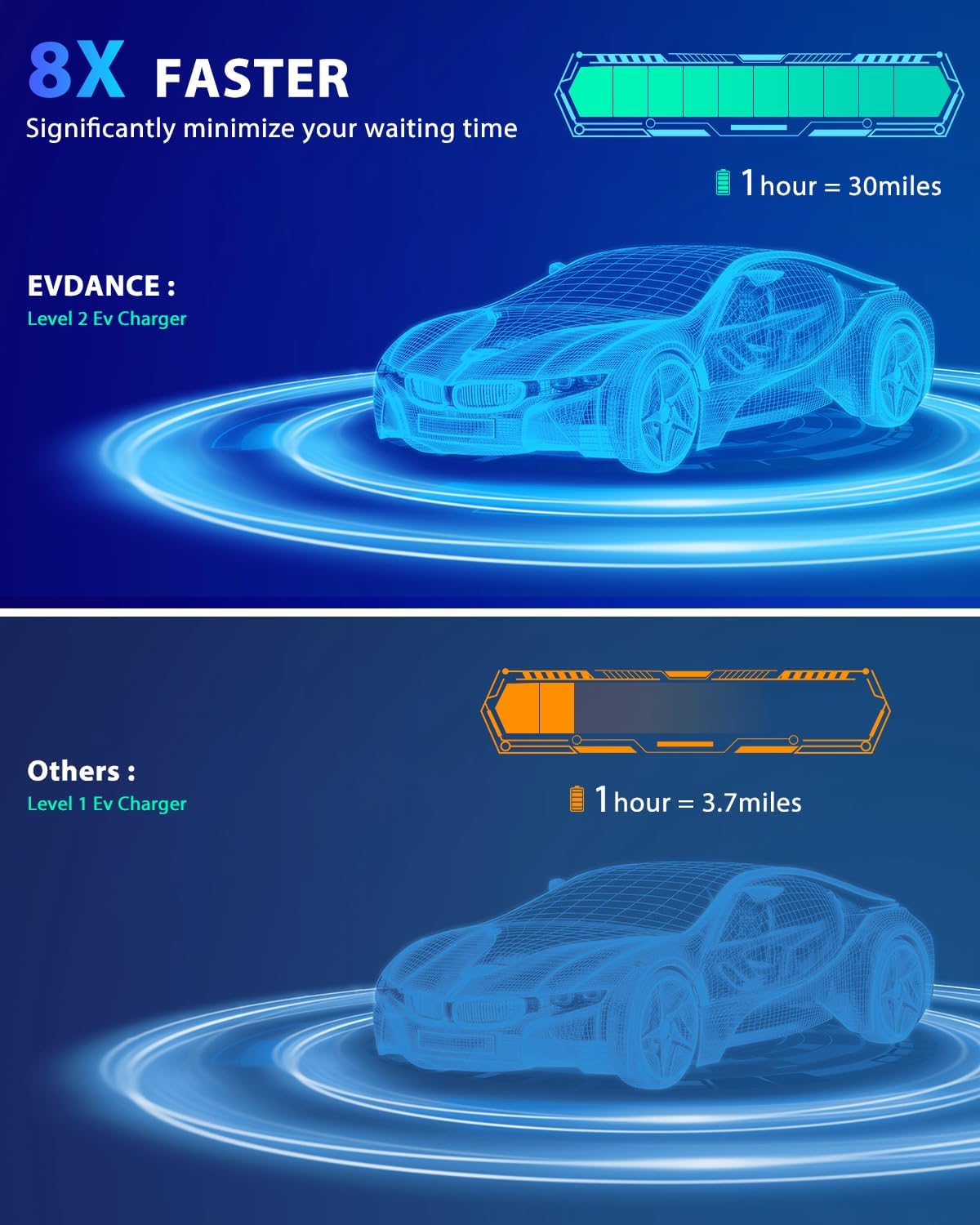 - 8X FAST CHARGING: This fast charging car charger operates at Level 2 capacity, delivering an impressive 40Amp/240V, providing a formidable 9.6 KW charging capability. Experience unparalleled speed as it charges your electric vehicle up to 8 times quicker (at an impressive rate of 29~36 miles per hour) compared to a standard Level 1 charger.