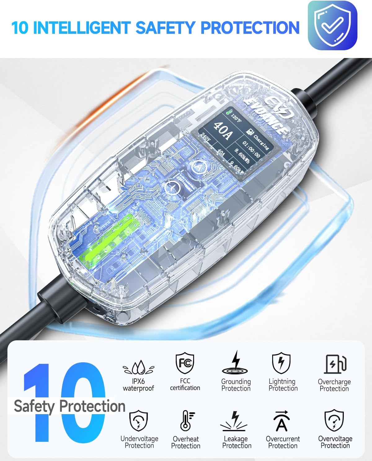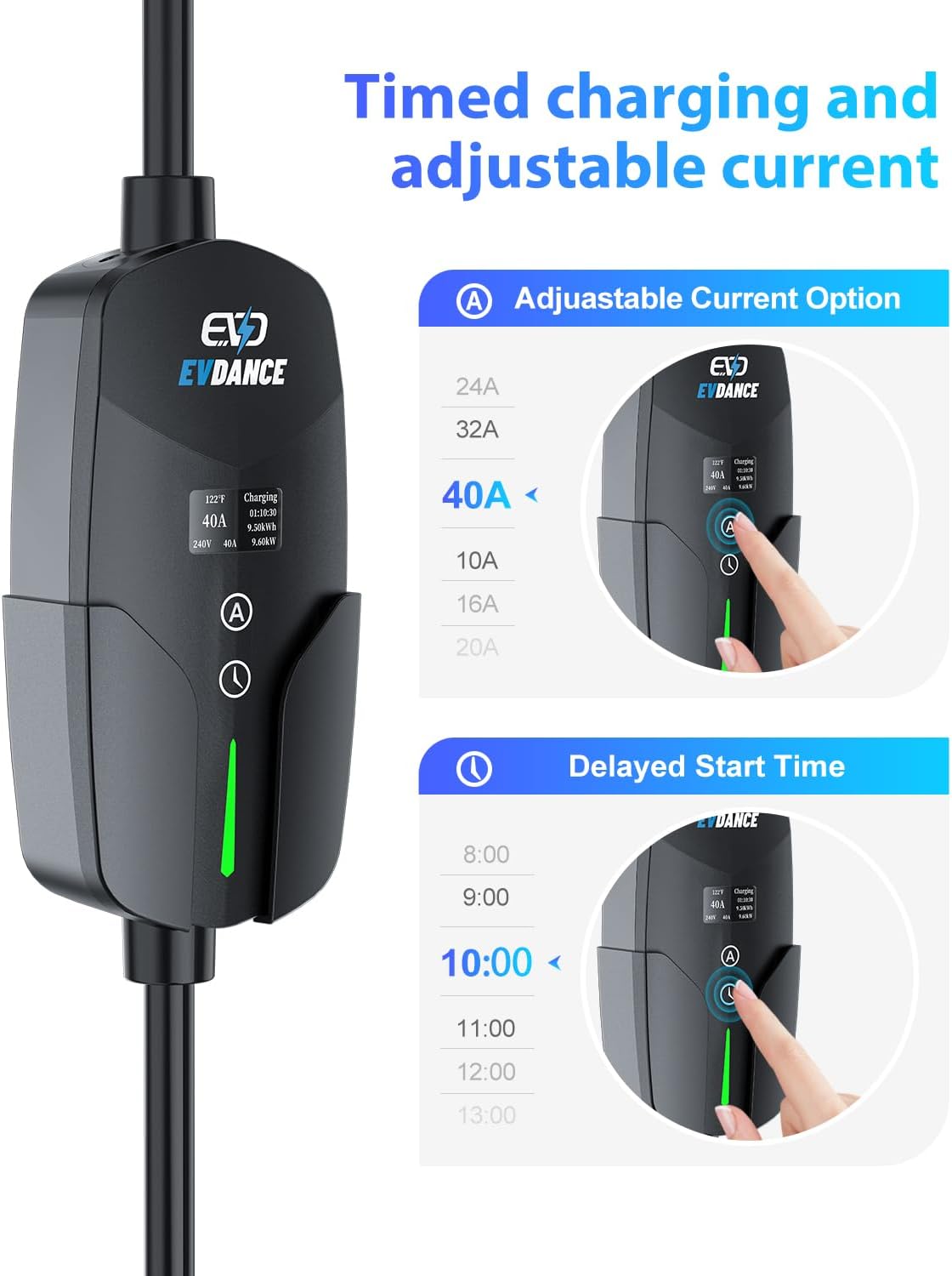 - SMART CHARGING: Adjust the current limit (10A/16A/20A/24A/32A/40A) to match your home’s circuit and with delay start, you can stagger the peak period of use to save electricity and reduce load