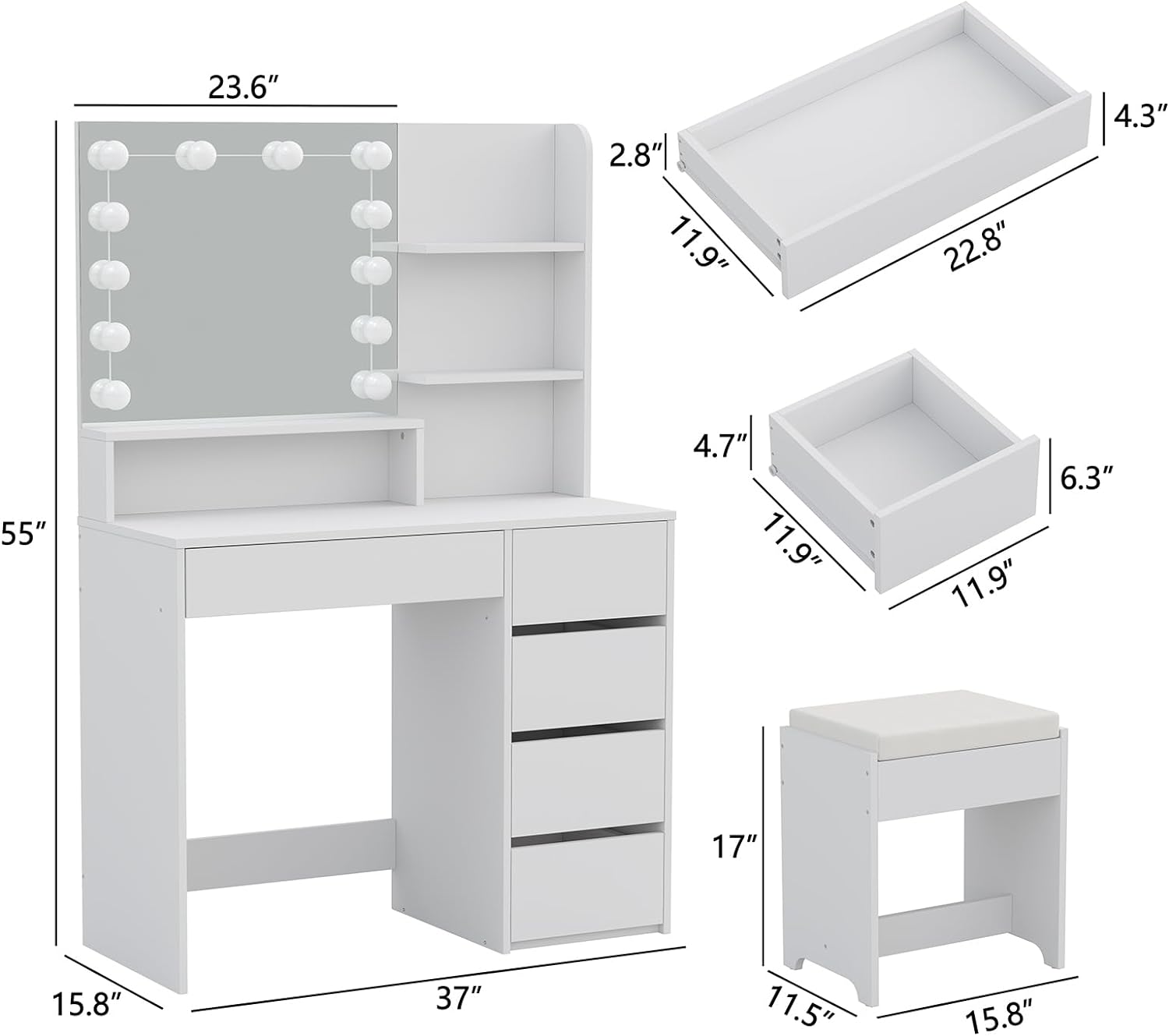 - ??Perfect Size for Bedroom & Nice Gift??makeup table size: 15.8″(D)x37″(W)x55″(H), Stool size: 11.5″(D)x15.8″x(W)x17″(H). Vanity Mirror: 20″(H) x23.6″(W).Has it tried and give a surprise to your girl, wife, or mom on a special day?