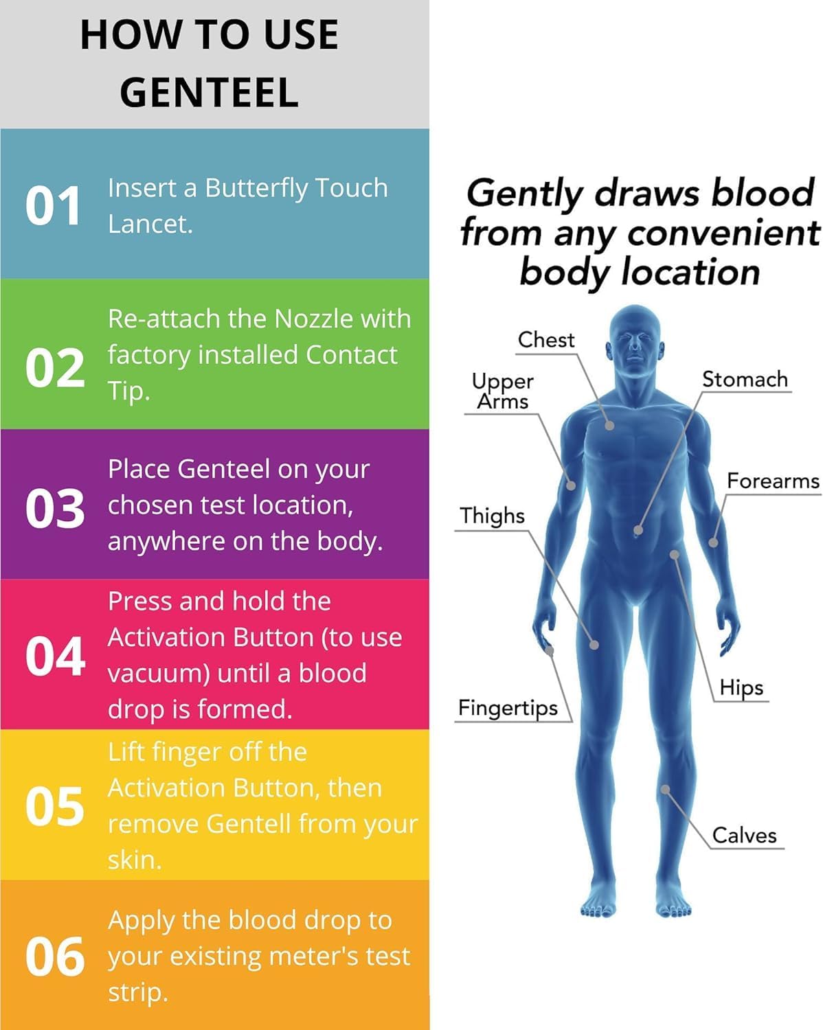 - Vacuum Technology – The Genteel lancing device is the world’s only lancing device that uses vacuum technology to draw blood. No more sensitivity and squeezing. Save yourself from pain and get blood anywhere from your body.
