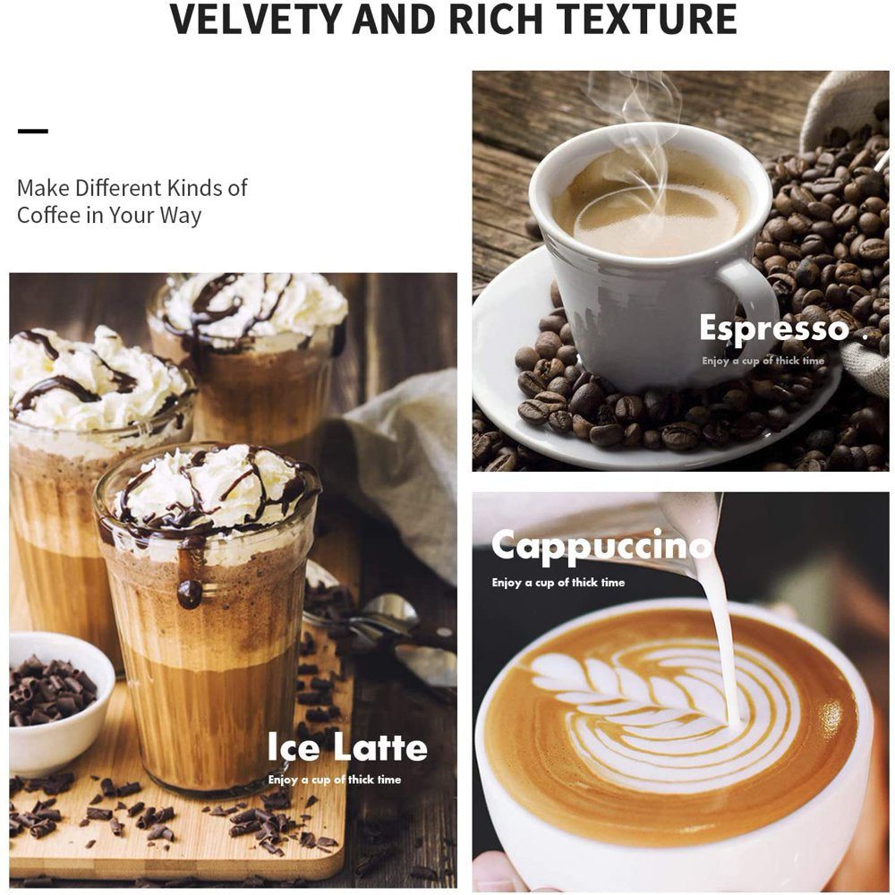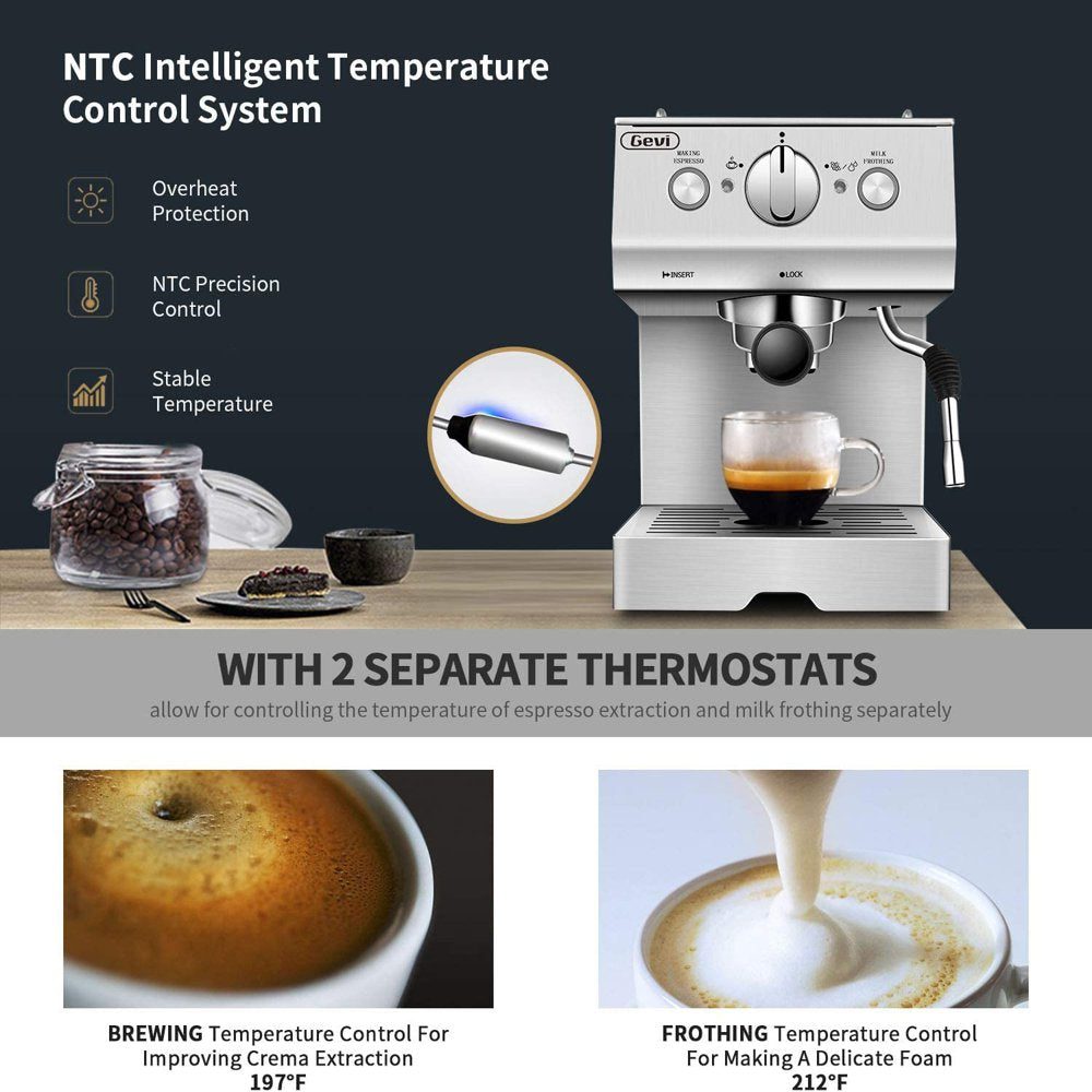 Gevi is a coffee brand that enhances people’s lives through thoughtful design and brilliant innovation in its coffee machines, empowering people’s potential and sparking their creativity to brew tasty coffee more impressively and easily than they’d thought possible. Gevi Silver Espresso Coffee Machine with 50 oz removable water tank has 15-bar pressure pump which ensures the coffee flavors, maintaining the aroma of the coffee. Expresso Coffee Machine reaches the optimal brewing temperature quickly and keep the coffee in a perfect temperature. WORRY FREE- We values your satisfaction. Every product from our Gevi (purchased via official or authorized channel) entitles 12-month warranty and lifetime tech support. Please feel free to contact us if you encounter any issue. PROFESSIONAL FROTHING WAND: Frothing milk for cappuccino and latte by hot steam wand. The steam wand rotate 360 degrees, which can produce silky and smooth milk foam better. DOUBLE TEMPERATURE CONTROL: With an accurate dual temperature control system, the temperature of water and the taste of milk foam, foam, coffee and milk can be adjusted to achieve the ideal state. HIGHLY CLEAR CONTROL: The clear temperature dial can observe the temperature changes, visualized operation, suitable for beginner coffee lovers. FOR BEST FLAVORS: Two cups of 60ml/ 2oz, about 14g/ 2 spoons powder for the best concentration. COFFEE DRINKS: Create an cappuccino, latte or flat white at home or office. The removable froth nozzle makes the cleaning easily. HUMANIZED DESIGN: Removable drip tray allows you to use a larger cup. SUS304 stainless steel nipple is not easy to rust. OPERATING TIPS: Turn off by yourself when reaching the desired amount of espresso. Please make sure that the funnel is firmly installed, otherwise it may fall off. SPECIFICATIONS: WHAT YOU GET: