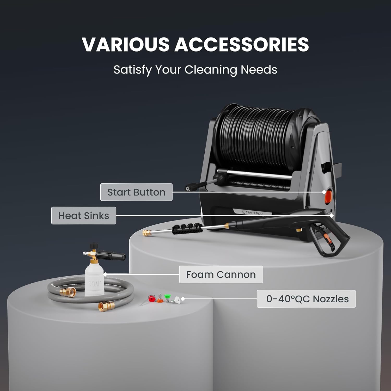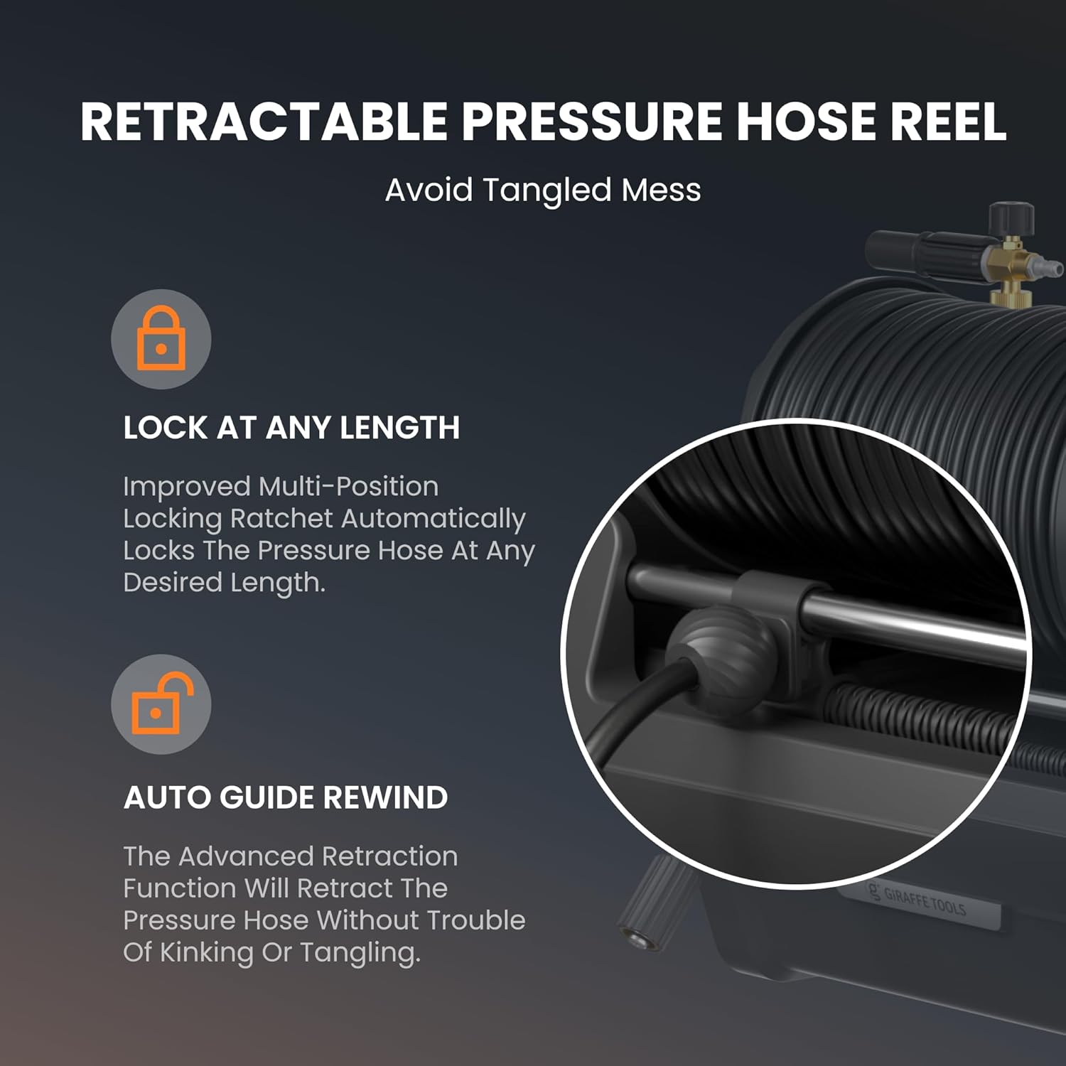 - Any Length Lock: Giraffe Tools power washer is pre-installed with a 100 ft retractable hose, which can lock at any length as you desired