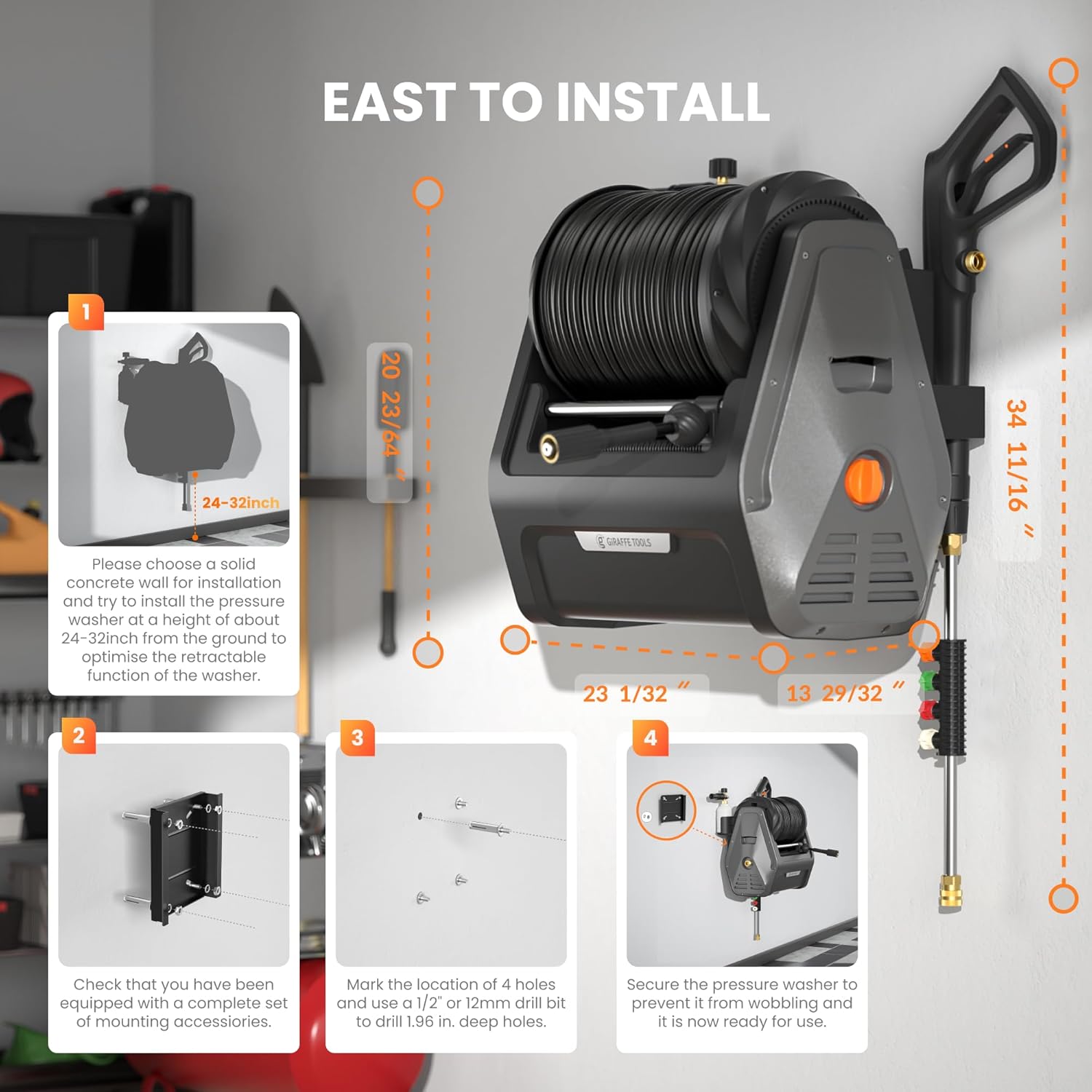 - Wall Mounted Pressure Washer: Hang it on the wall to keep everything organized and your garage free of clutter. No more lugging a power washer around. 100 ft of pressure hose and a 6 ft power cord combine to make reach and mobility seamless. Allow you to effortlessly complete cleaning tasks in a variety of locations