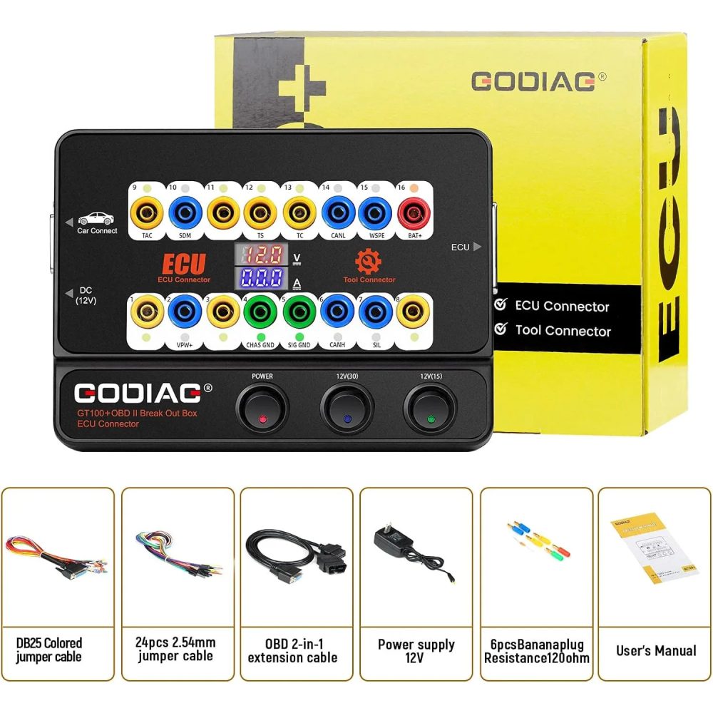 - ??Easy Operation With Banana Plug & Current Display??Compared with similar tools, GT100+ OBDII Breakout box features with simple operation and additional features for doing ECM, ECU repair on vehicles. GT100+ breakout box connects with ECU module via banana plug or DB25 connector, not only providing power to ECU,but also directly displaying electronic current value. You can easily judge whether your cable has connected correctly or the ECU module is in good condition.