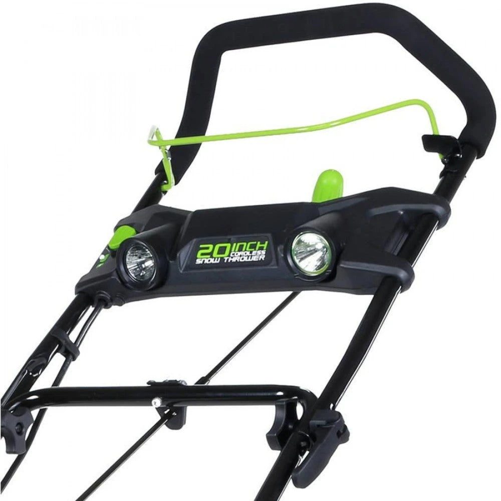 Snow Thrower, 20 In. Clearing Path, Auger Diameter 7 In., Inlet Height 10 In., Battery Operated Torque, Battery Type Lithium-Ion, Engine Brand Greenworks DigiPro, Voltage 80, Drive Gears 1 Forward, Drive Type Auger, Stages 1, Start Type Electric, Number of Batteries 1, Wheel Dia. 6 In., Wheel Width 2 In., Auger Type Plastic, Chute Construction Stainless Steel/Plastic, Chute Rotation Manual, Chute Turning Radius 180 Degrees , No Integrated Hand Warmers, Lights Yes