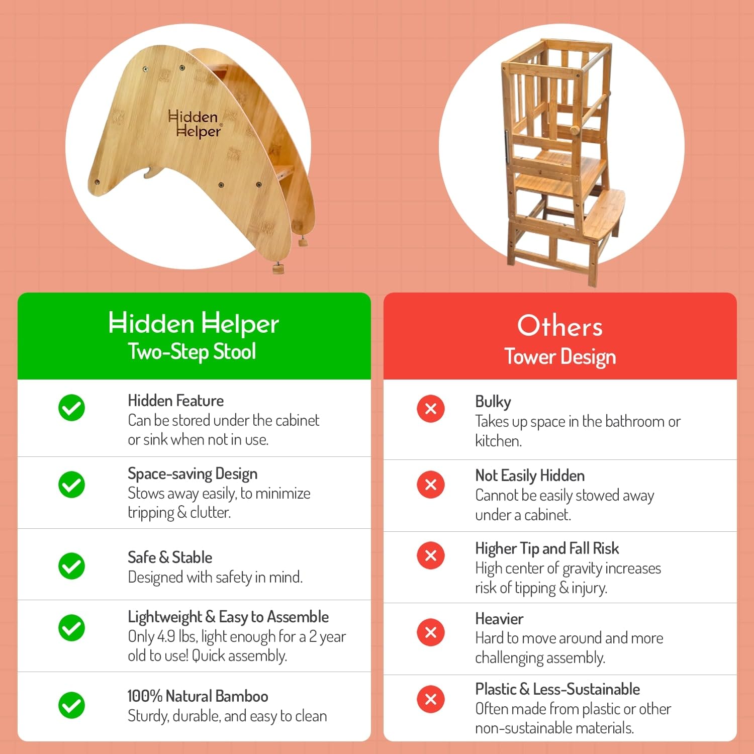 - SPACE-SAVING DESIGN: Kitchen towers and bathroom step stools for kids are functional, but we think they should be hidden when not in use! Hidden Helper’s innovative stow-away design prevents tripping and minimizes clutter. Our motto is, ??Helpful when you need it, Hidden when you don’t.