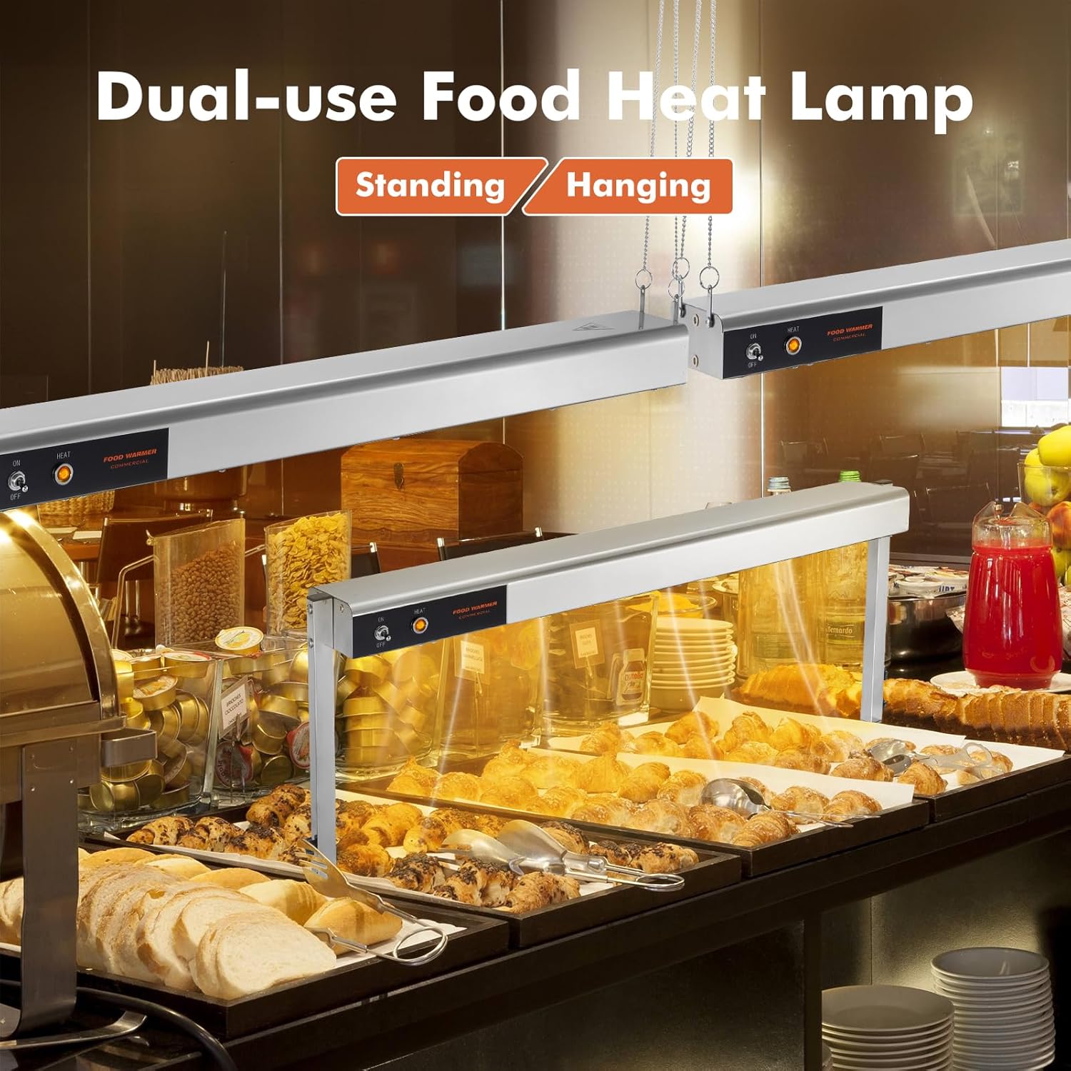 - ??Dual-use Food Heat Lamp??: The food heat lamp can be used in both standing and hanging styles. You can choose to place it on a countertop, such as a buffet table or service counter. It can also be hung directly above using the included chain, such as in a kitchen rack or restaurant ceiling. flexible for use in busy kitchens or limited countertop spaces.