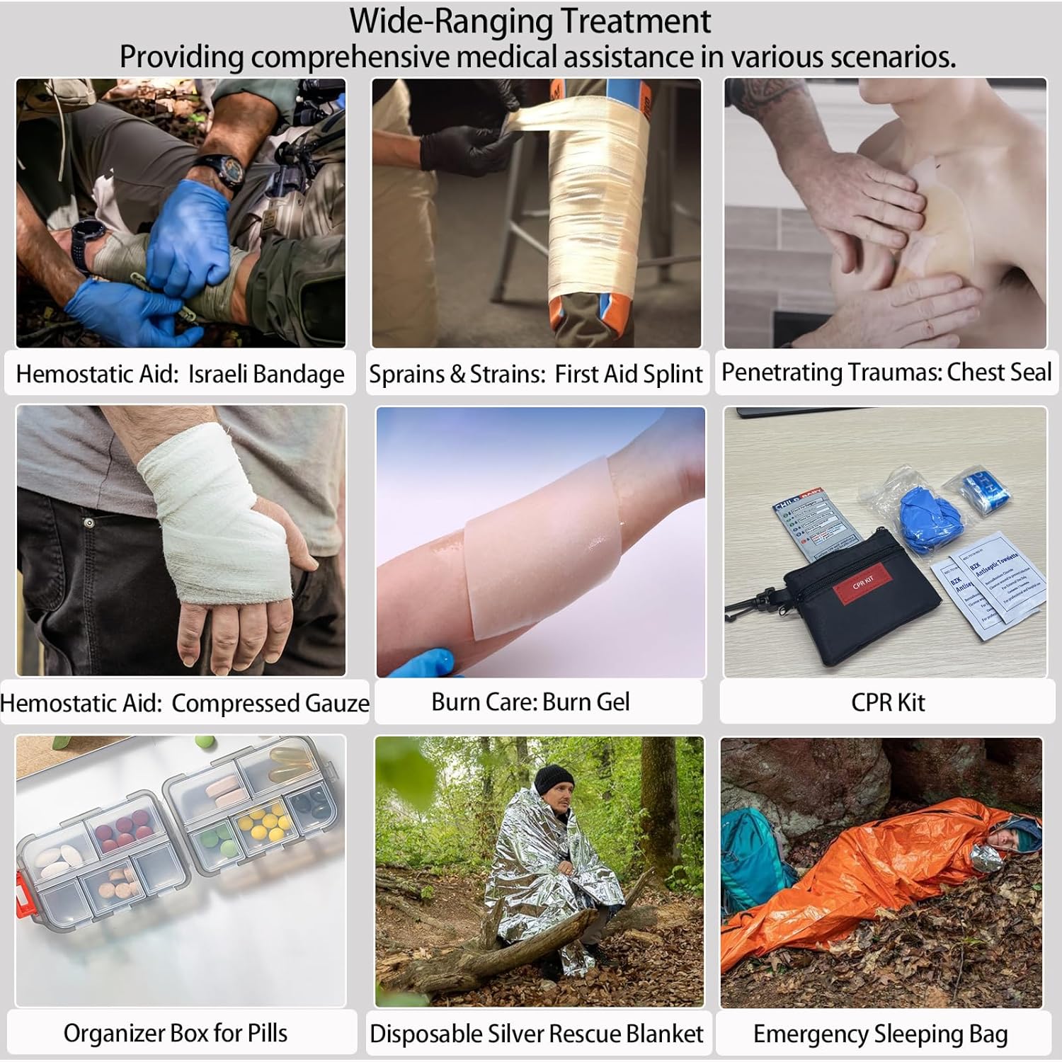 - First Aid Suppiles for Comprehensive Usability:This is a Premium first aid kit with advanced accessories upgraded by a professional team. Helps with emergency needs outdoors, home, or in the car, such as camping, hiking, or during hurricanes and tornadoes
