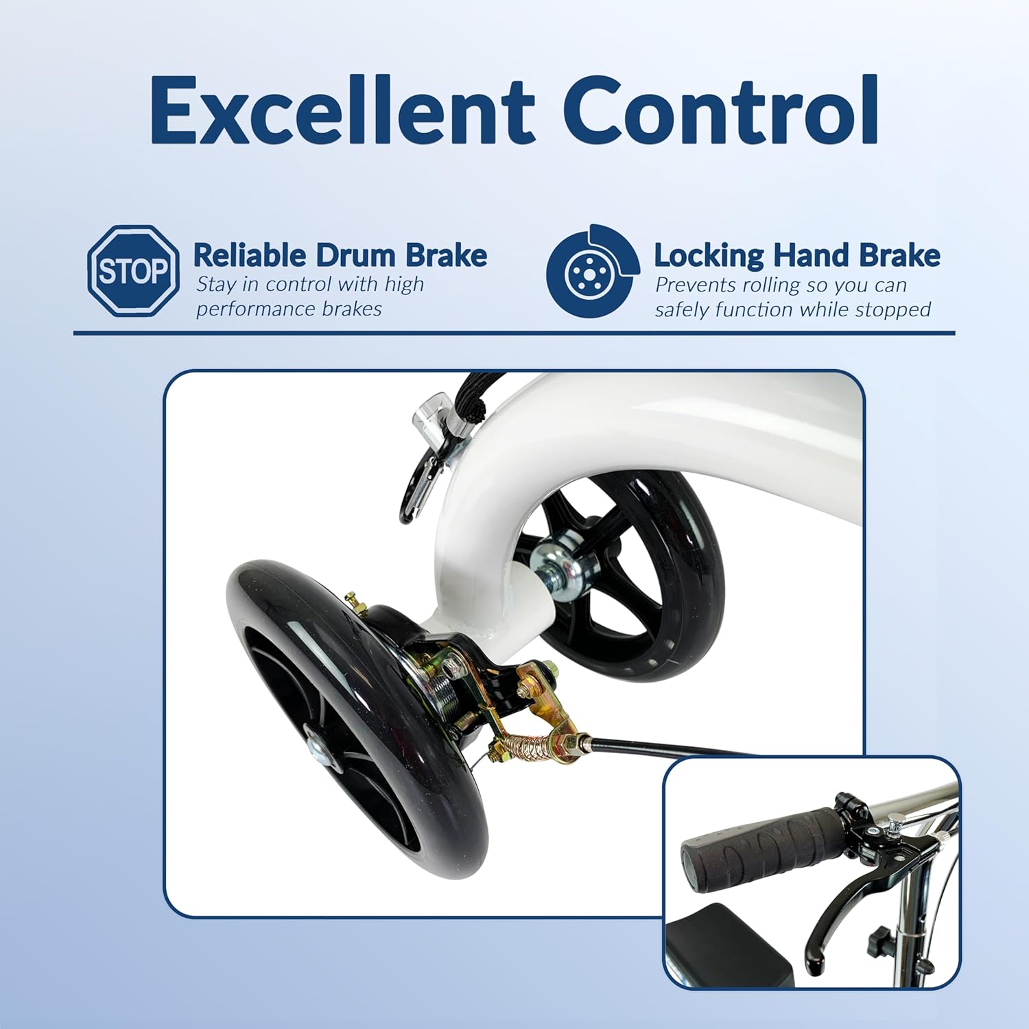• STABILITY & CONTROL: Easy to maneuver steerable knee scooter walkers feature four smooth 7.5″ non-marking PU wheels, reliable rear drum brakes, and an adjustable locking handbrake.